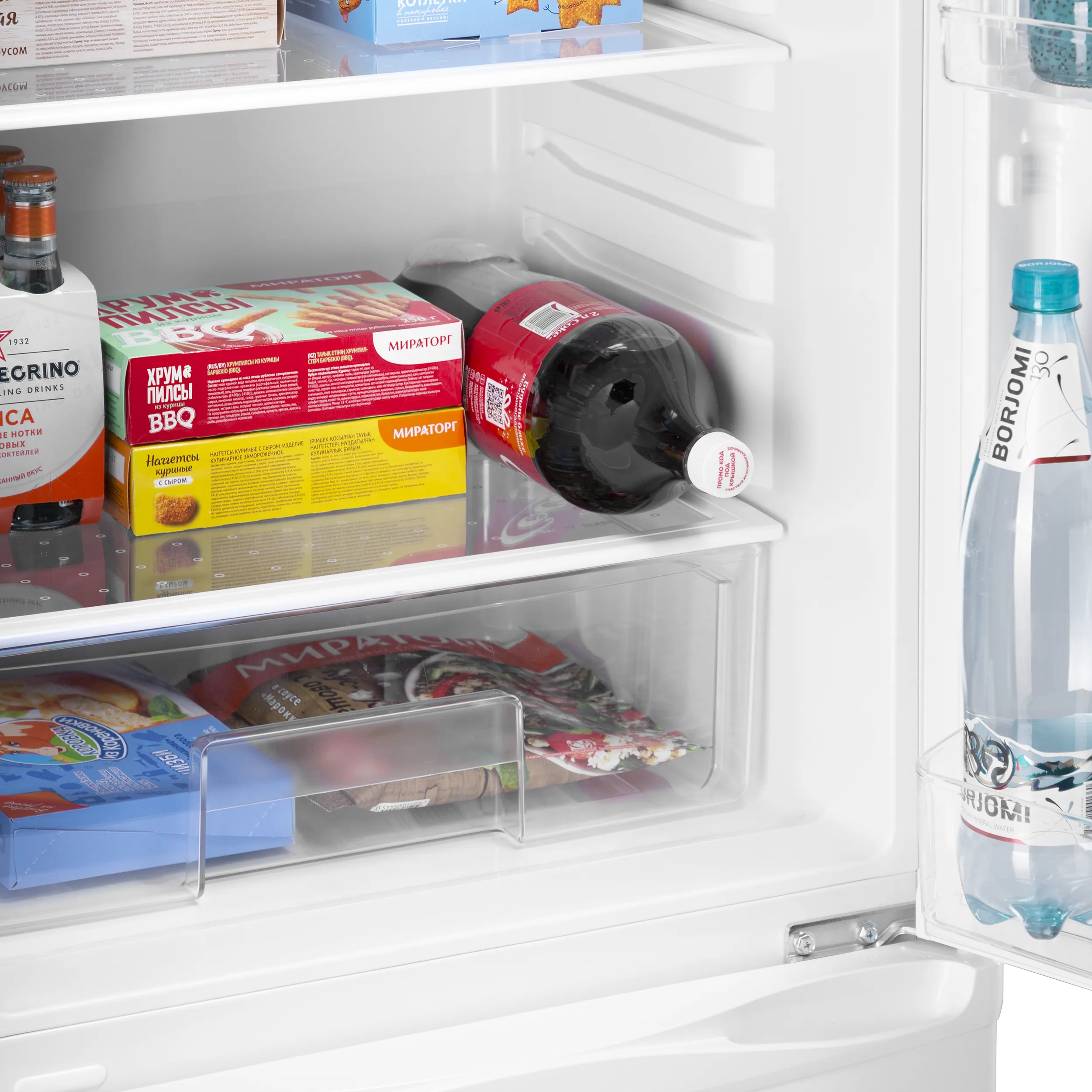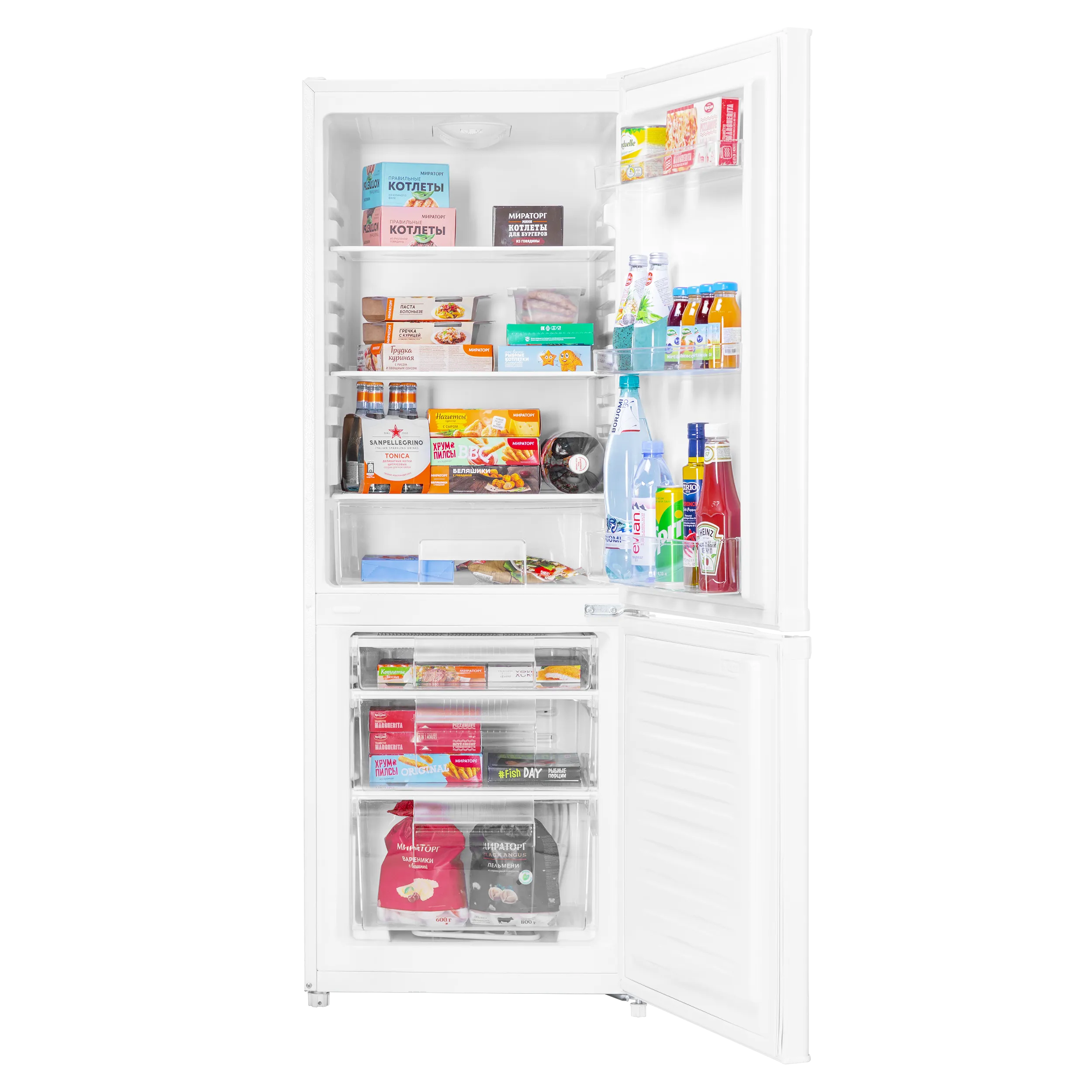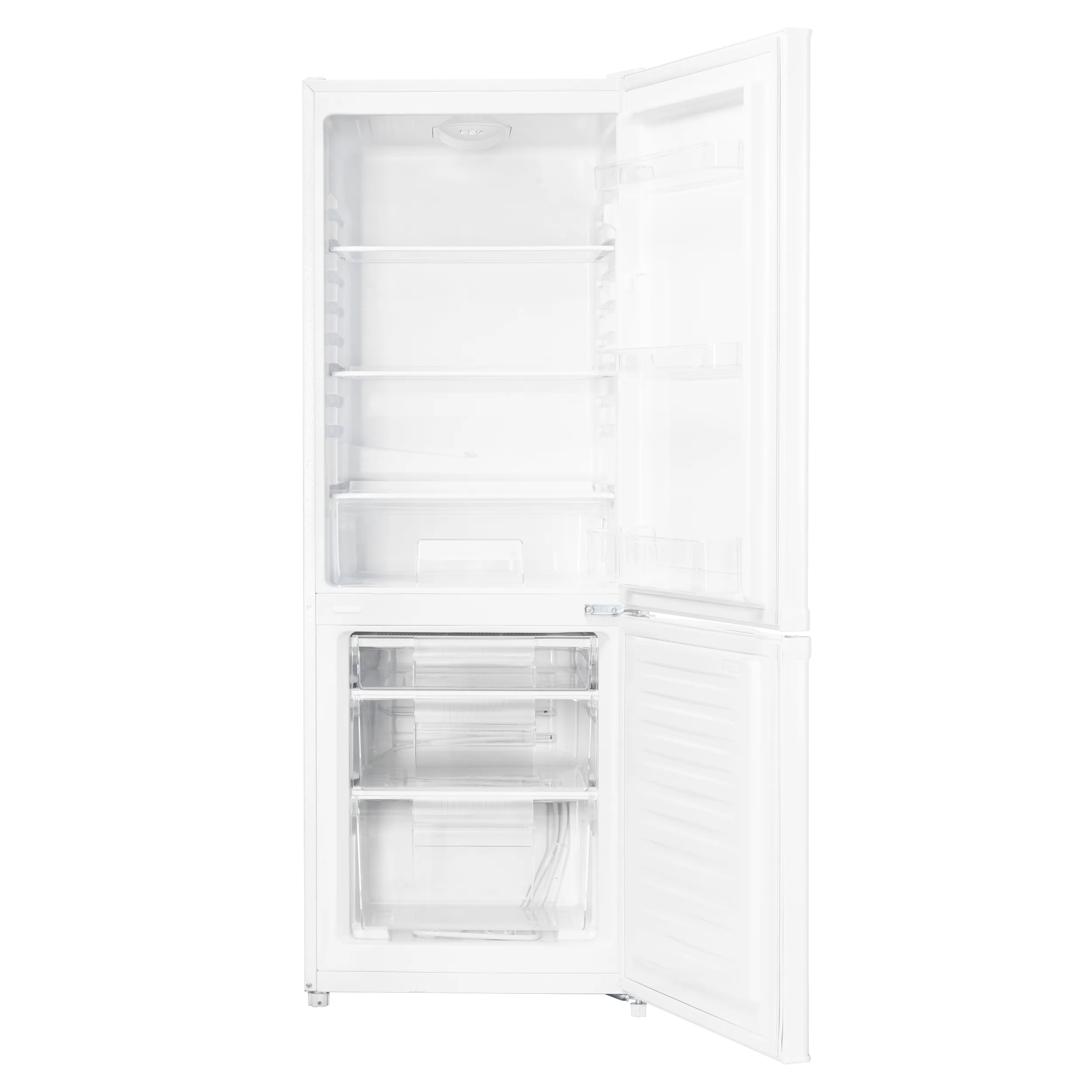 Двухкамерный холодильник с тремя вместительными ящиками в морозильной камере и ящиком для овощей и фруктов. Полки из закаленного стекла переставляются по высоте, а дверцы перенавешиваются для удобства доступа с любой стороны.
