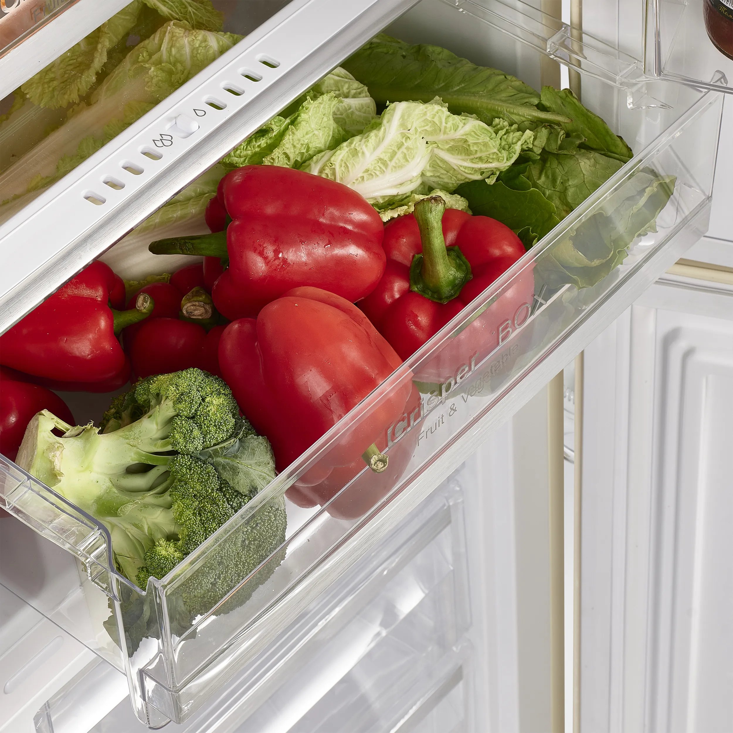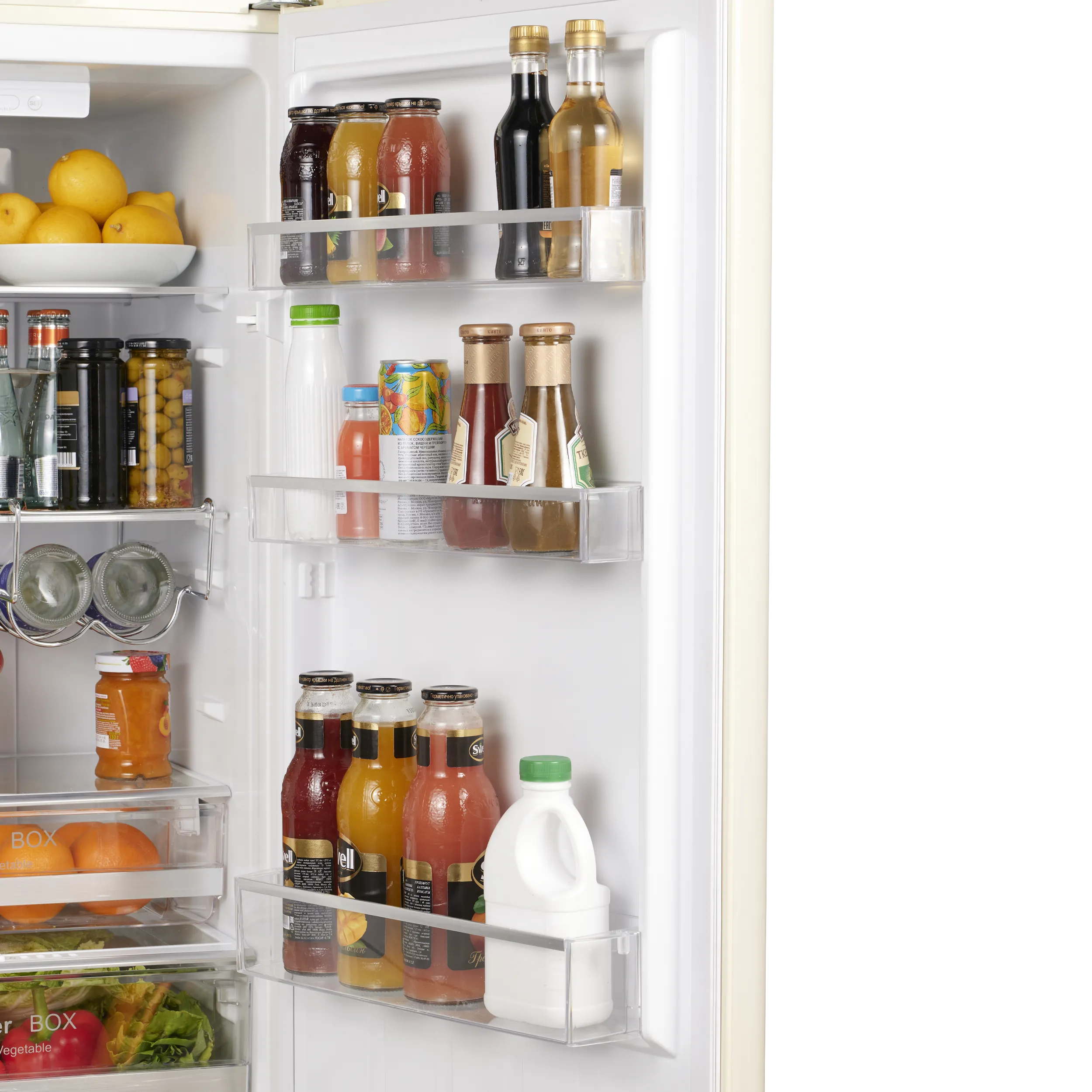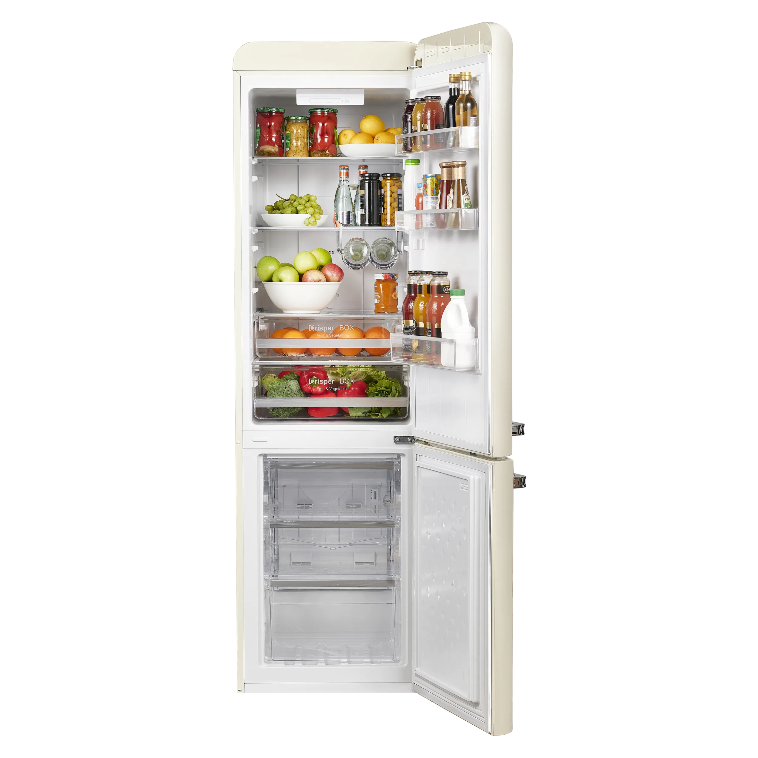 Двухкамерный холодильник в ретро-дизайне  NO FROST шириной 54 см с многопоточным охлаждением, электронным управлением. Фасад выполнен из яркого пластика.