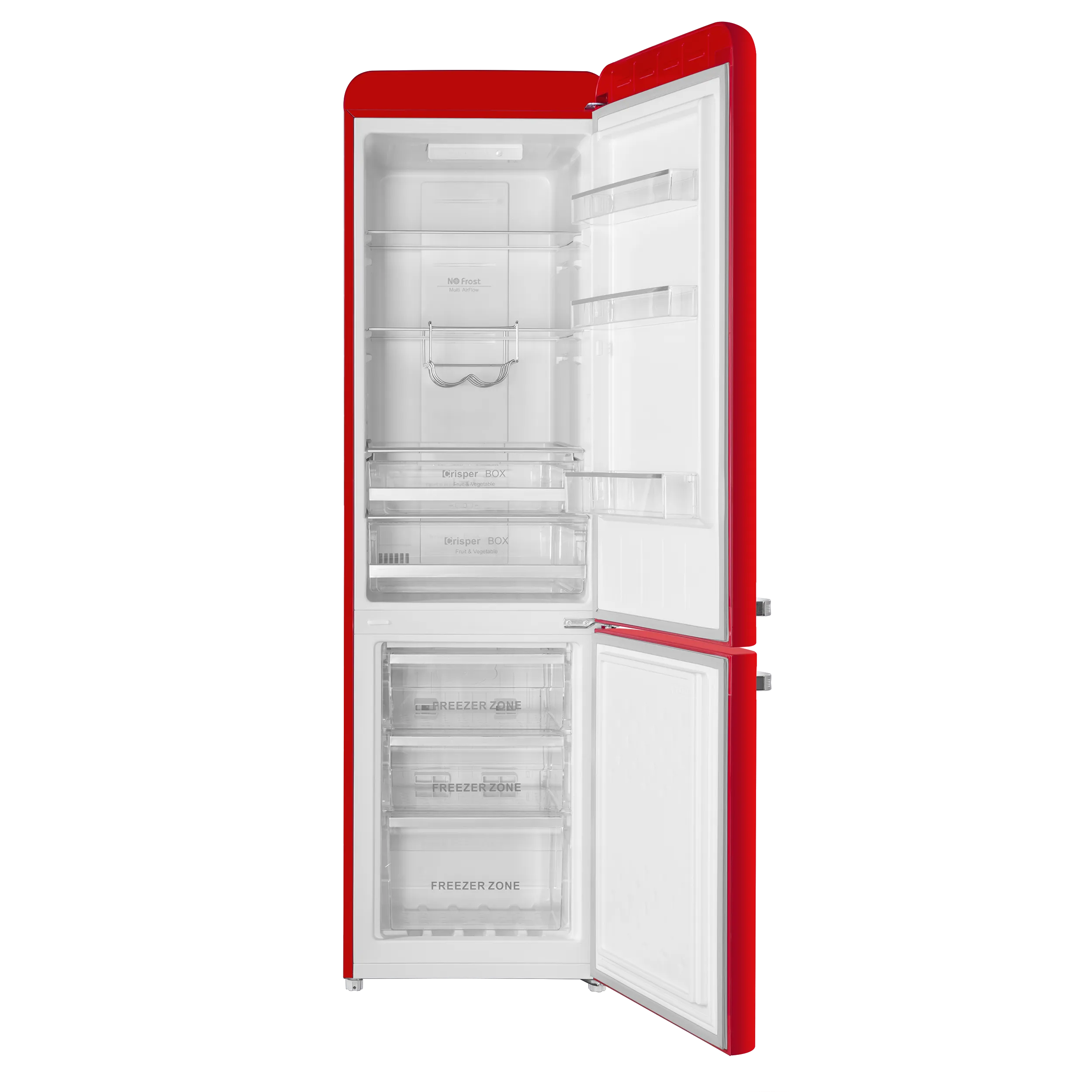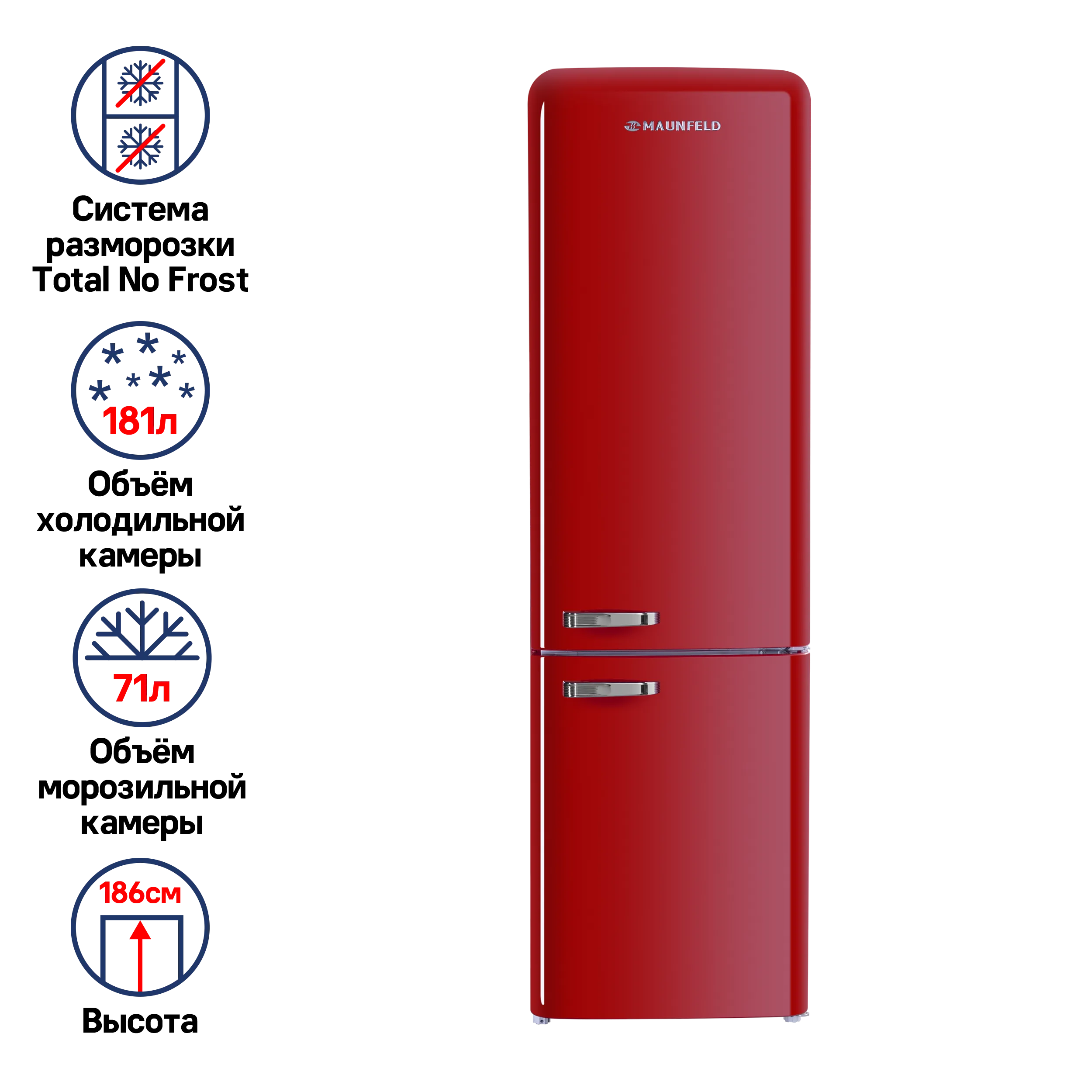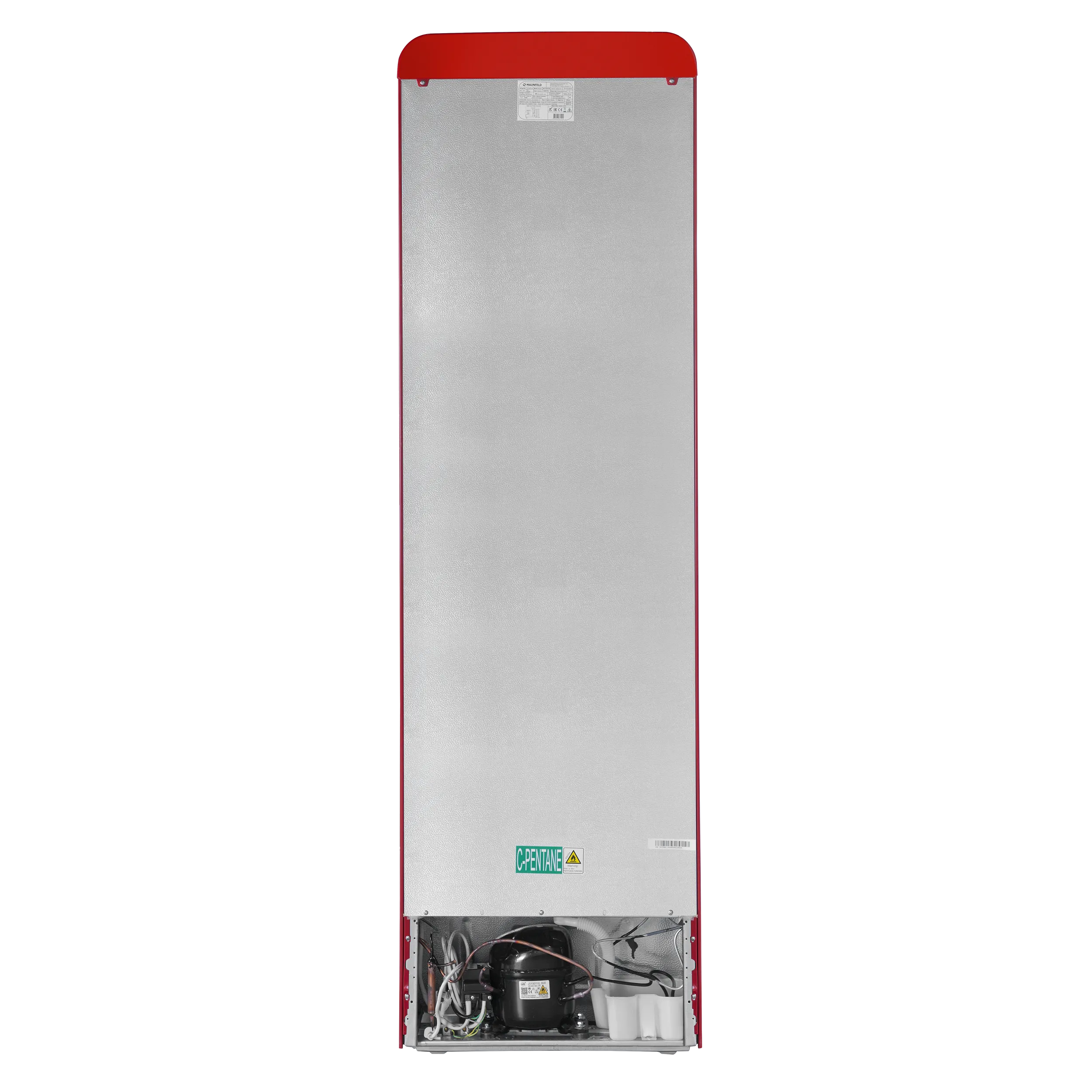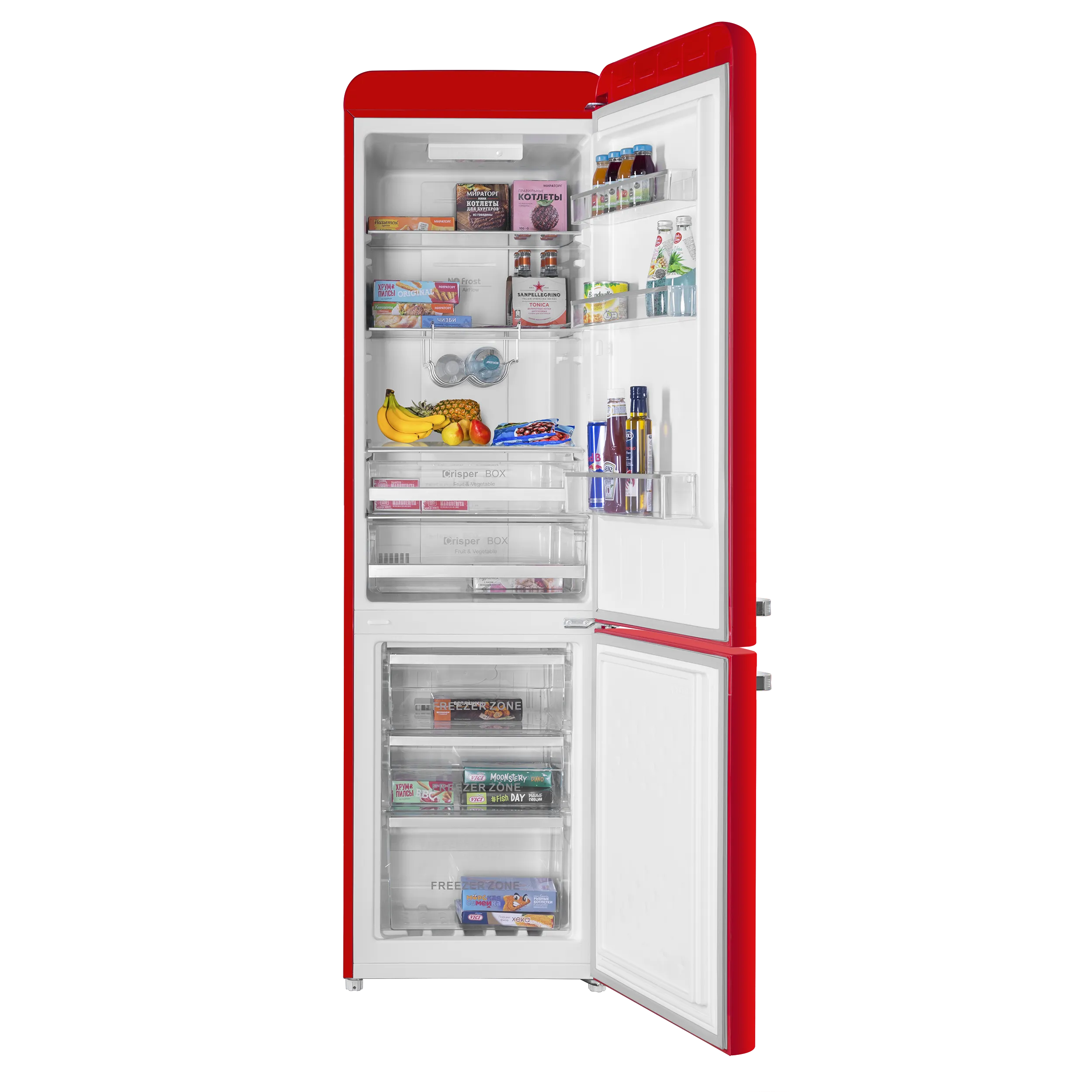 Двухкамерный холодильник в ретро-дизайне  NO FROST шириной 54 см с многопоточным охлаждением, электронным управлением. Фасад выполнен из яркого пластика.