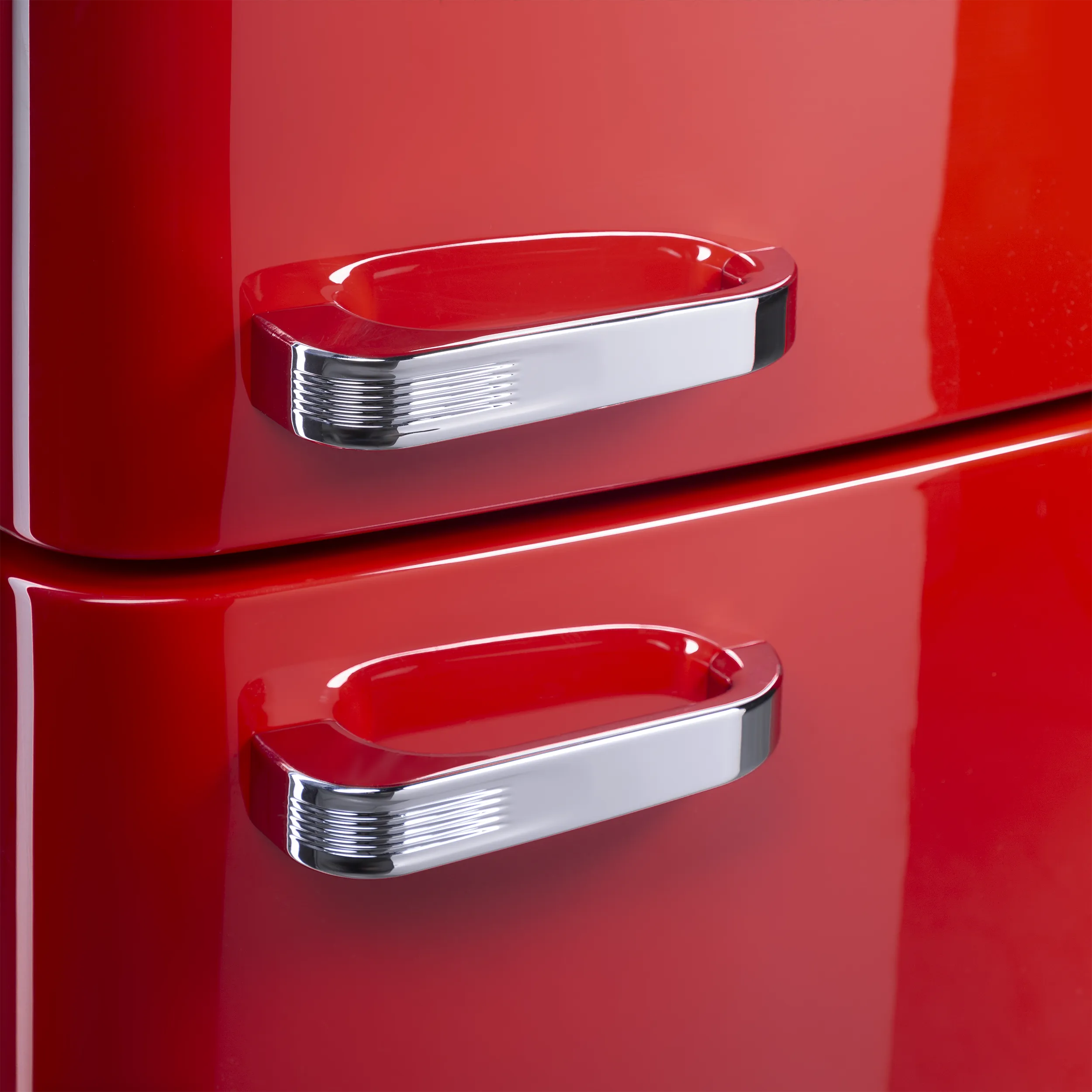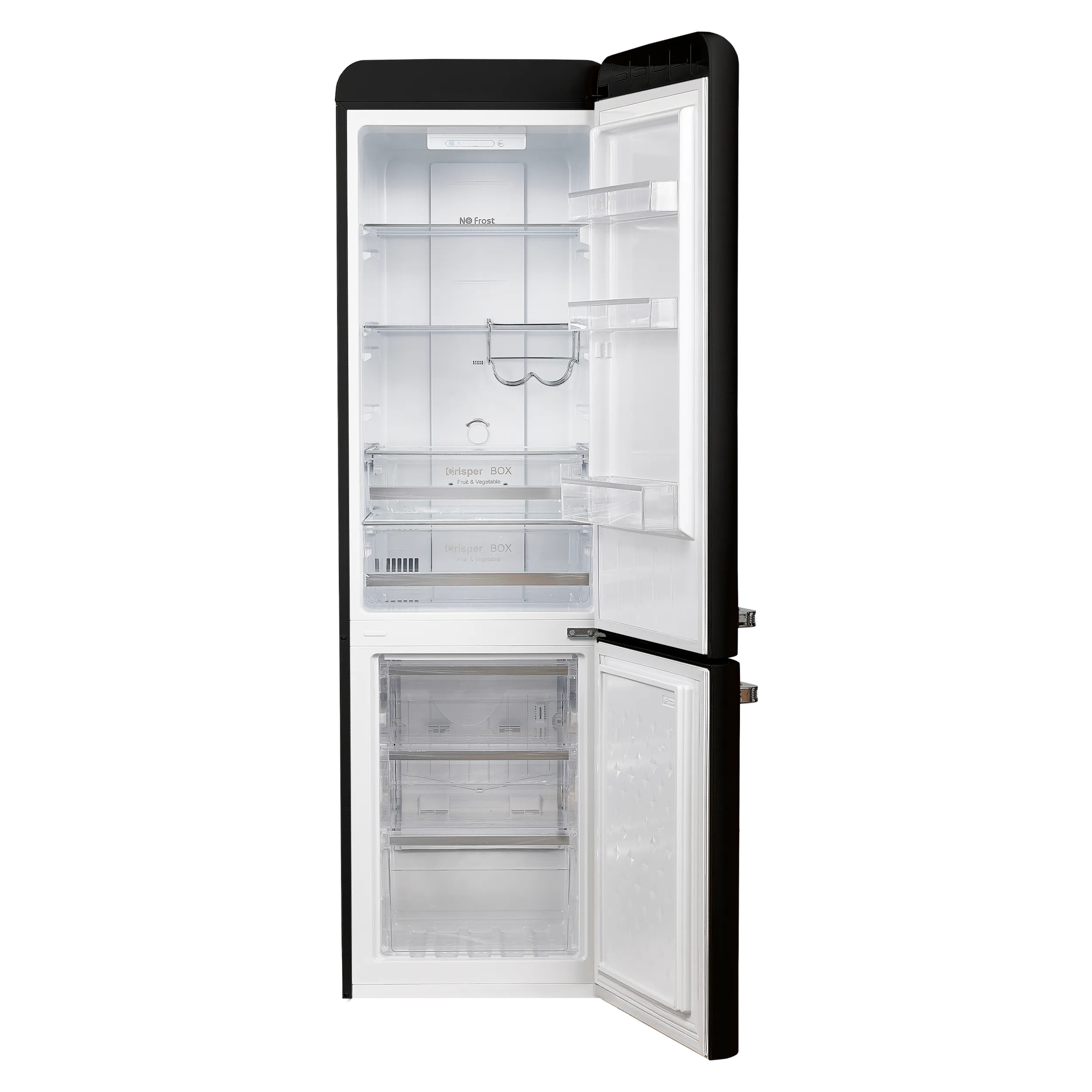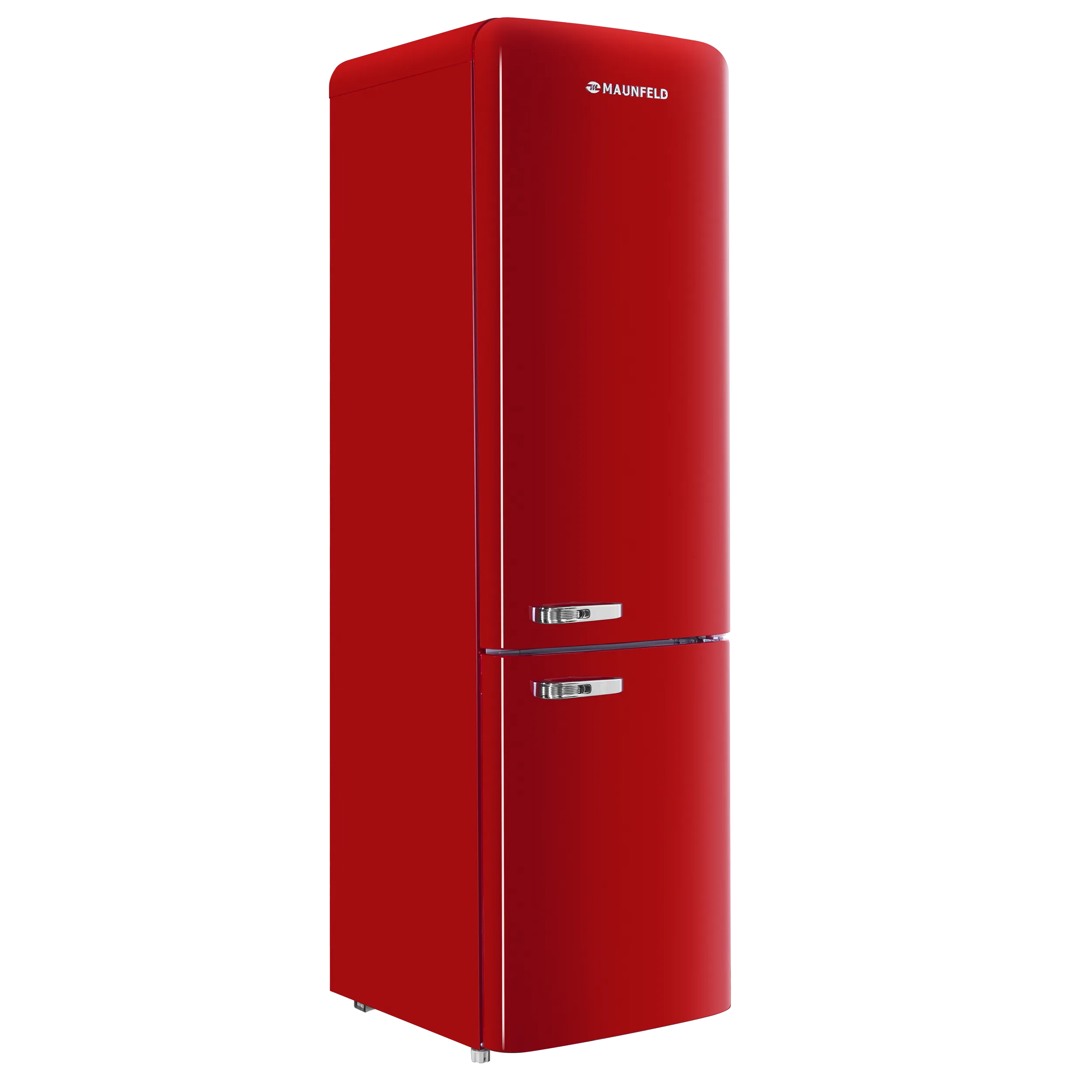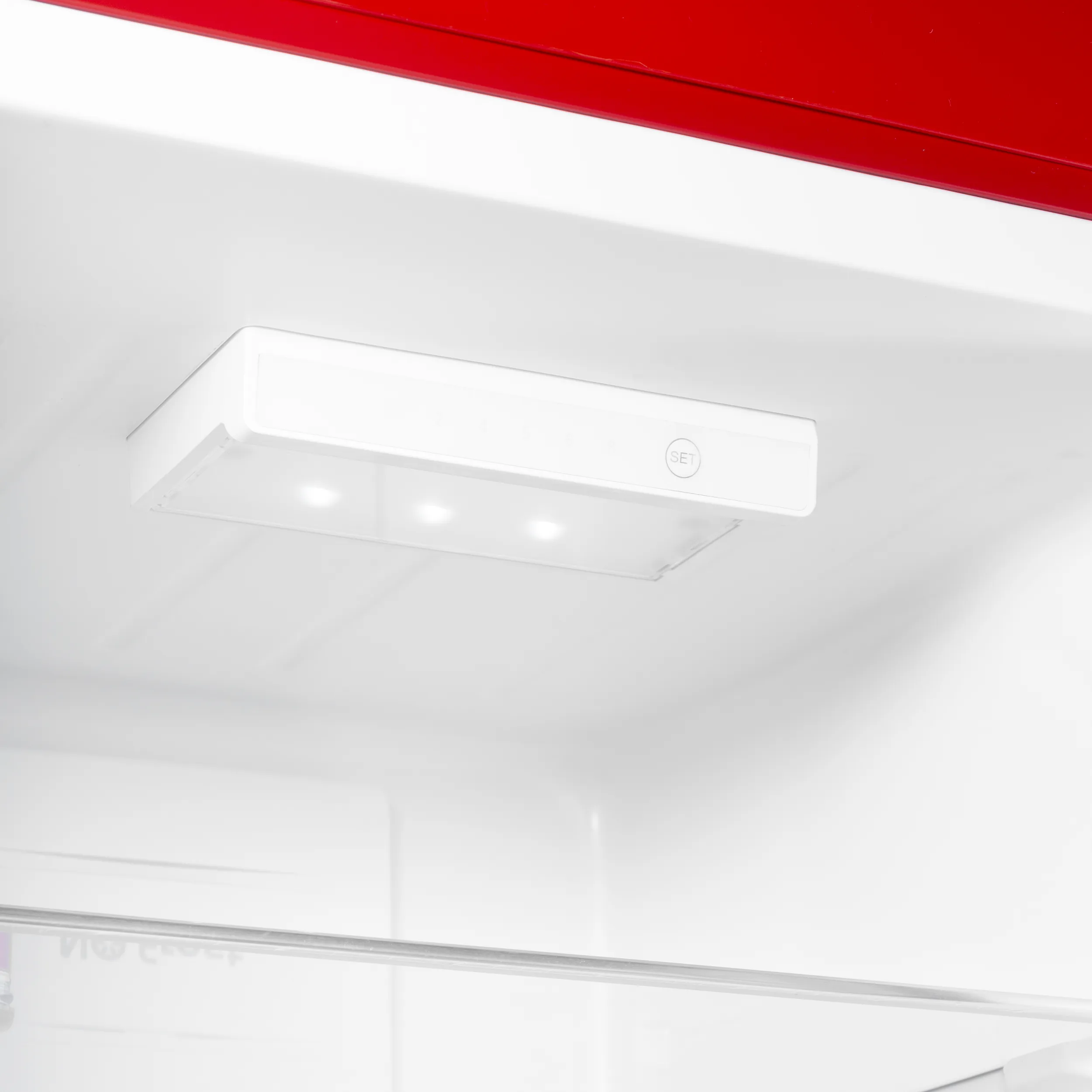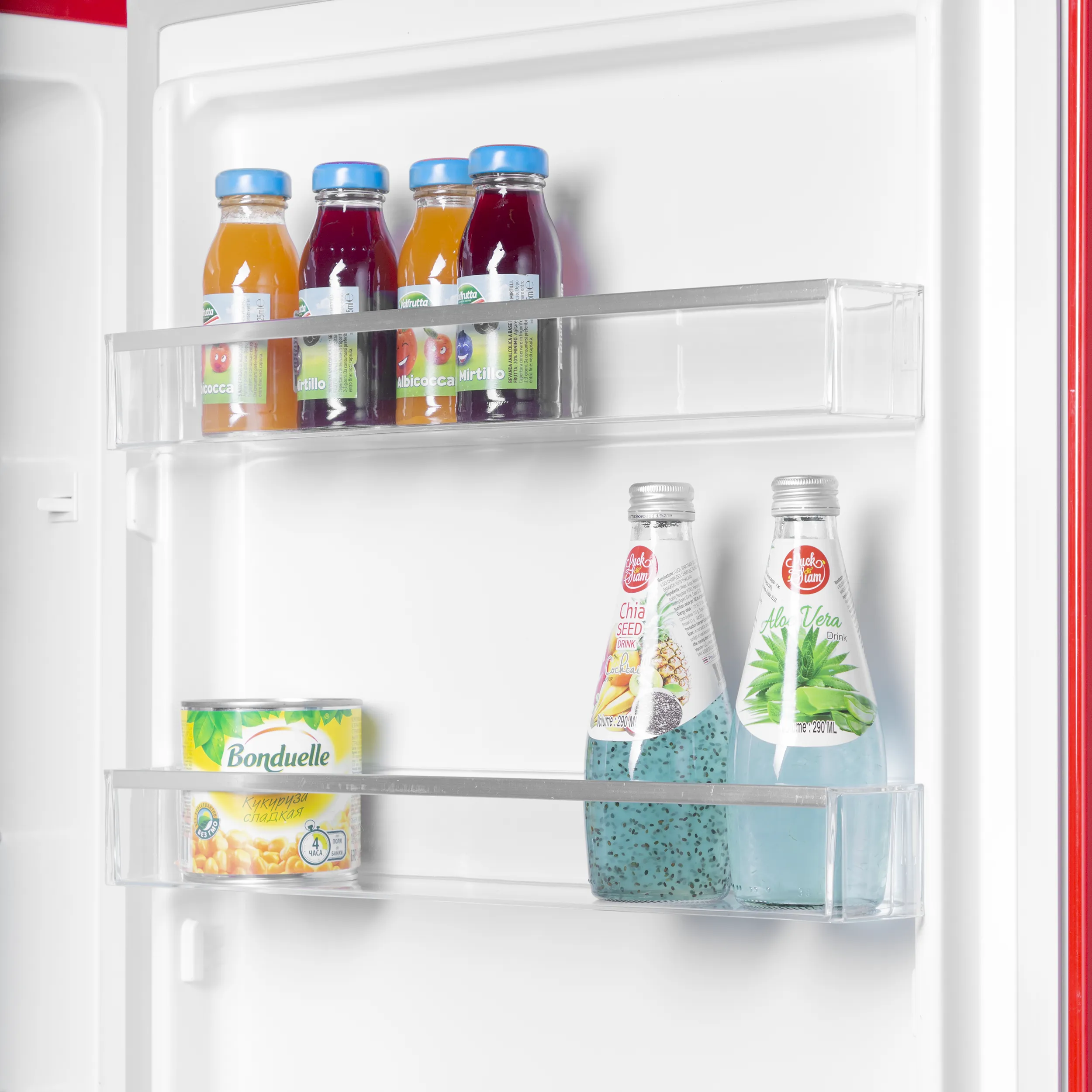 Двухкамерный холодильник в ретро-дизайне  NO FROST шириной 54 см с многопоточным охлаждением, электронным управлением. Фасад выполнен из яркого пластика.