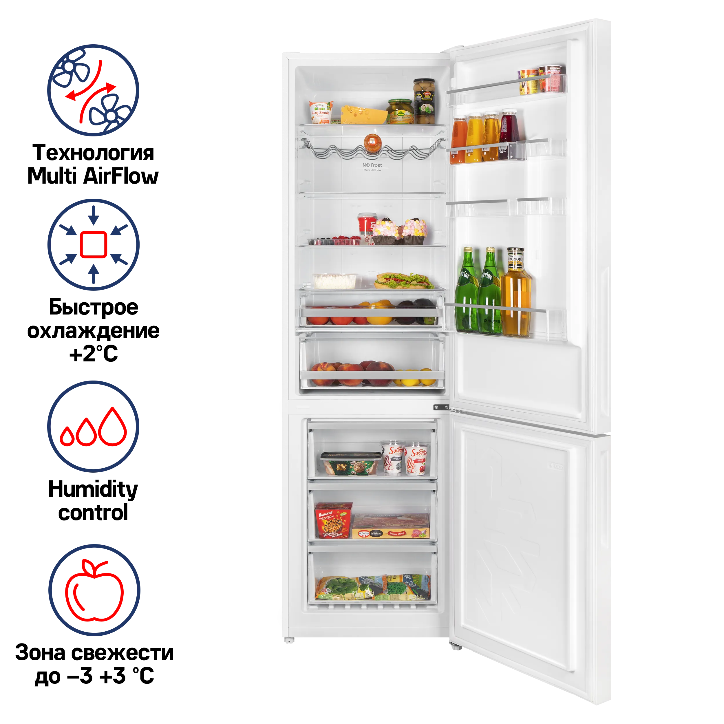 Дисплей, Звуковая индикация при открытых дверях, Наличие зоны свежести, Перенавешиваемые двери, Полка для бутылок, Система NO Frost, Требуется фото при отгрузке, Учет серийных номеров