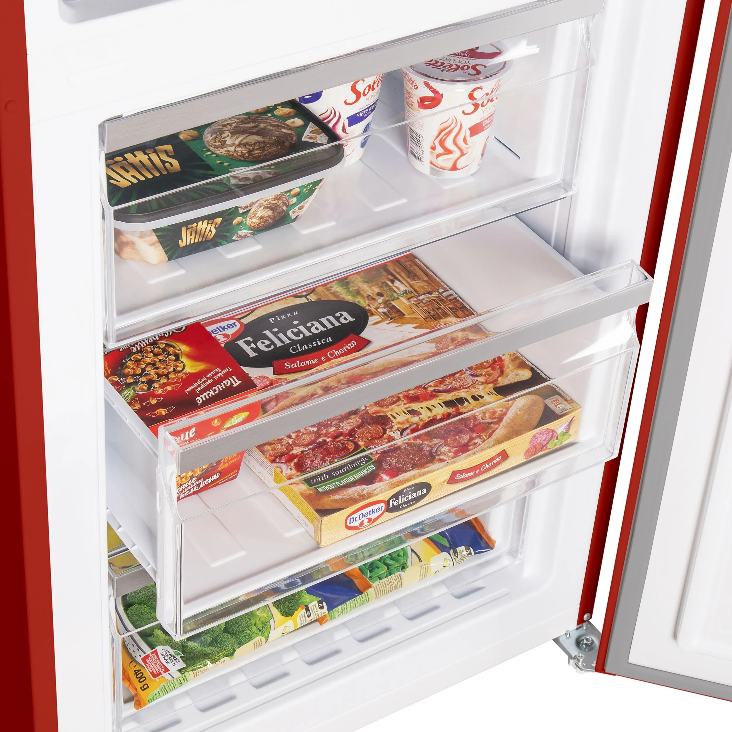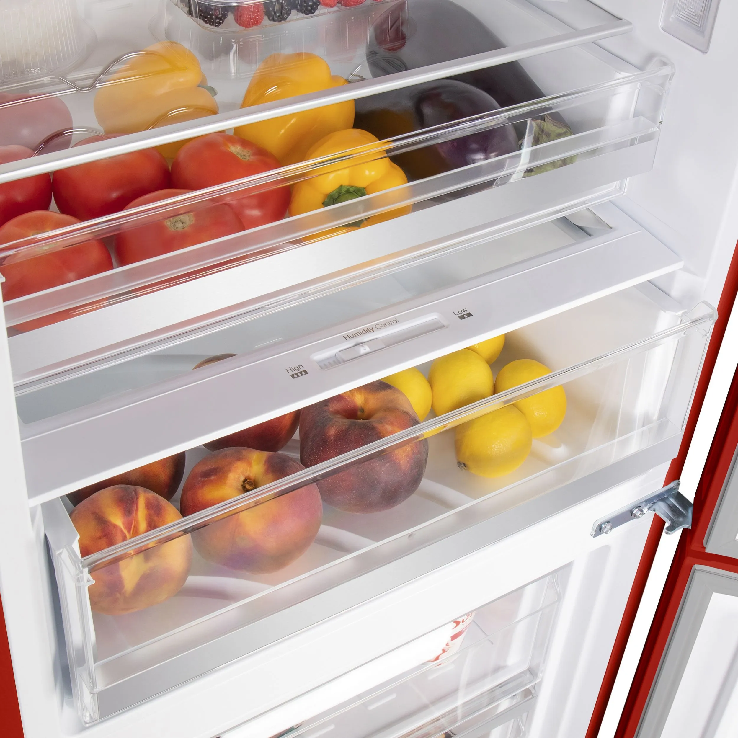 Полки из закаленного стекла, ящики в холодильной и морозильной камере, полки на двери.
