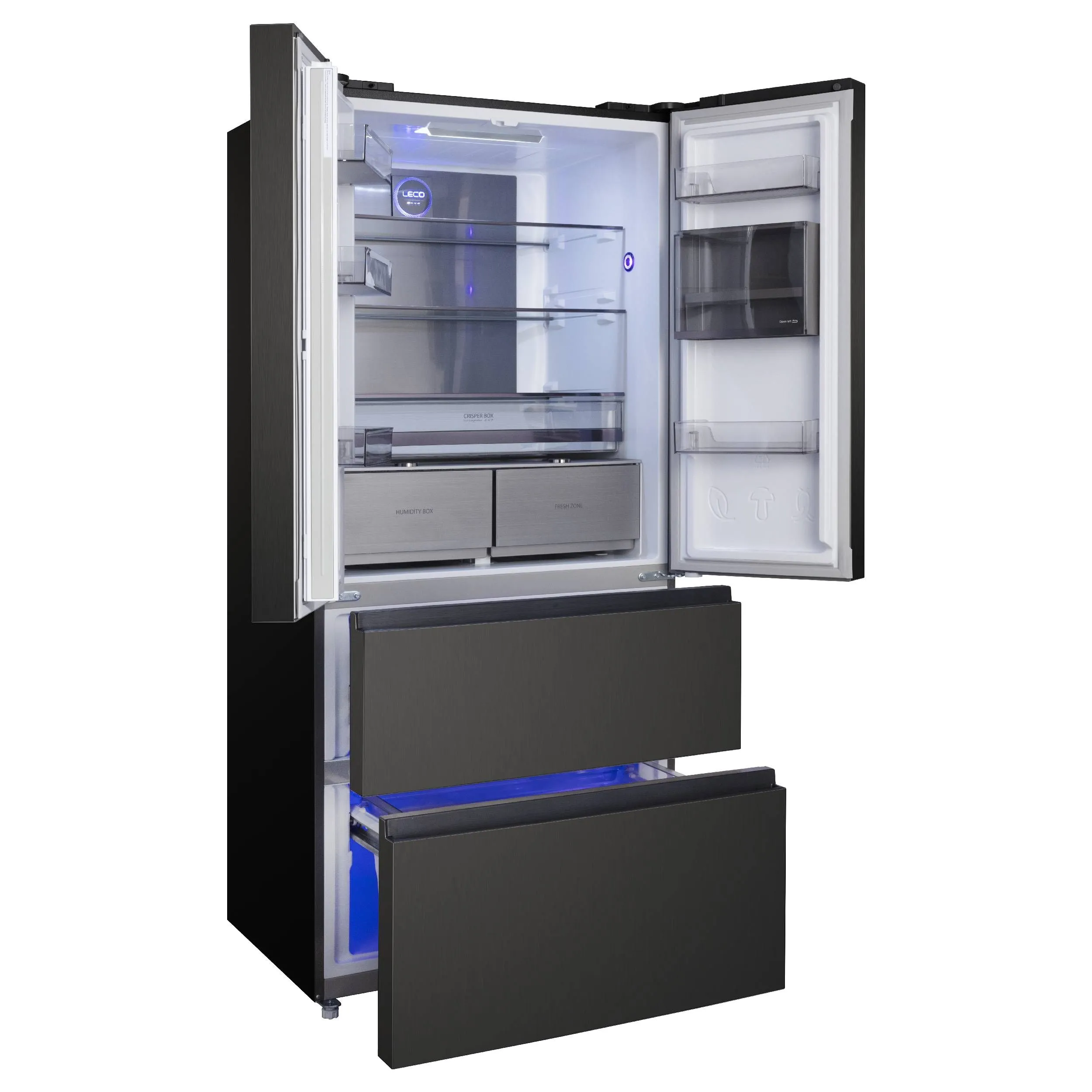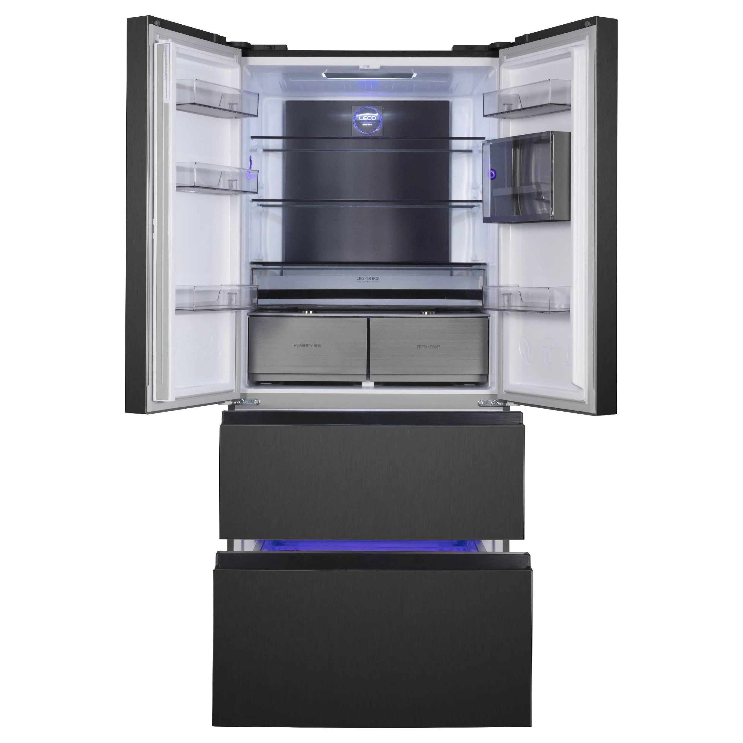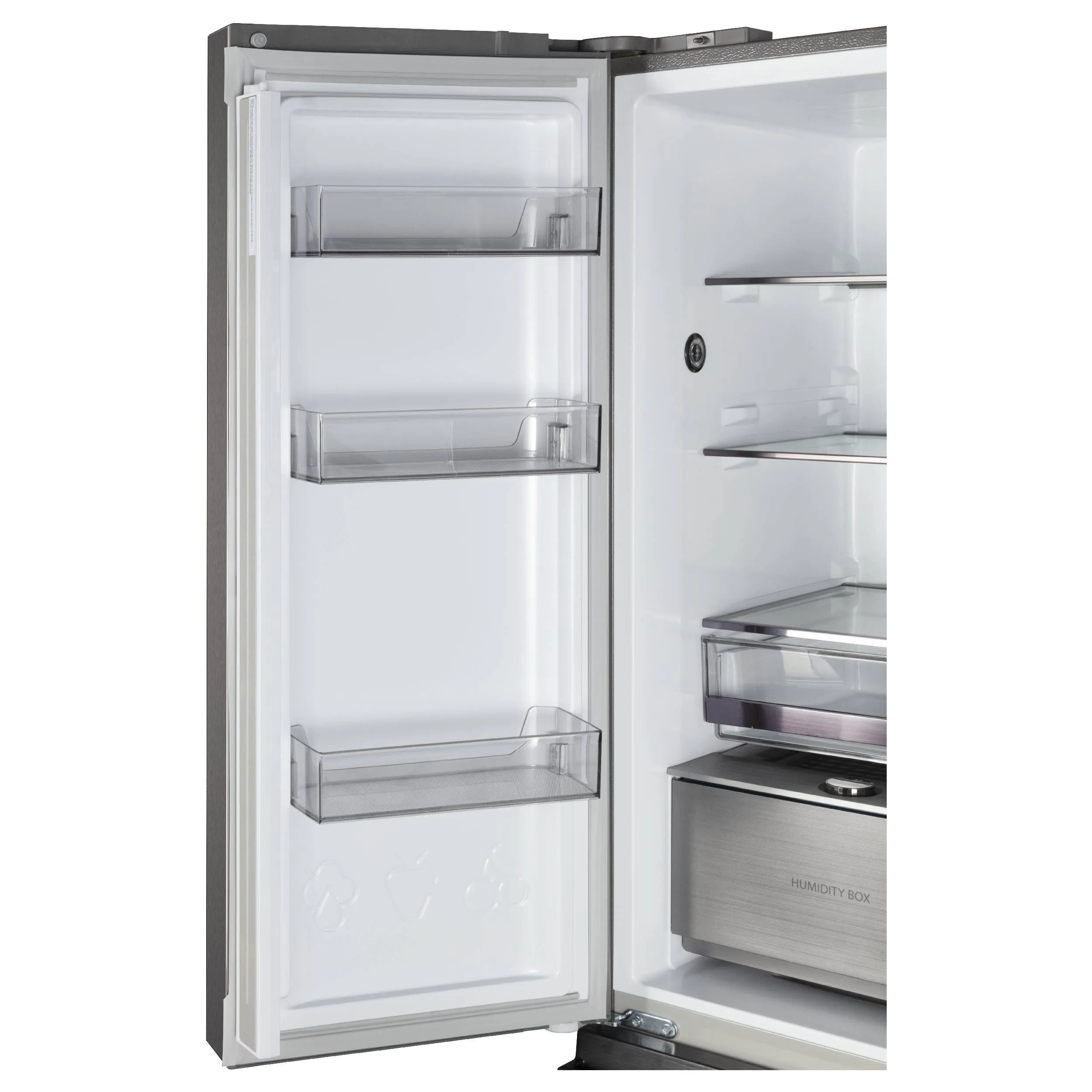 Стеклянные полки, 2 ящика для овощей в холодильном отделении с регулировкой уровня влажности, Устройство для приготовления льда ICE MATIC, LED освещение, Функция суперзаморозки