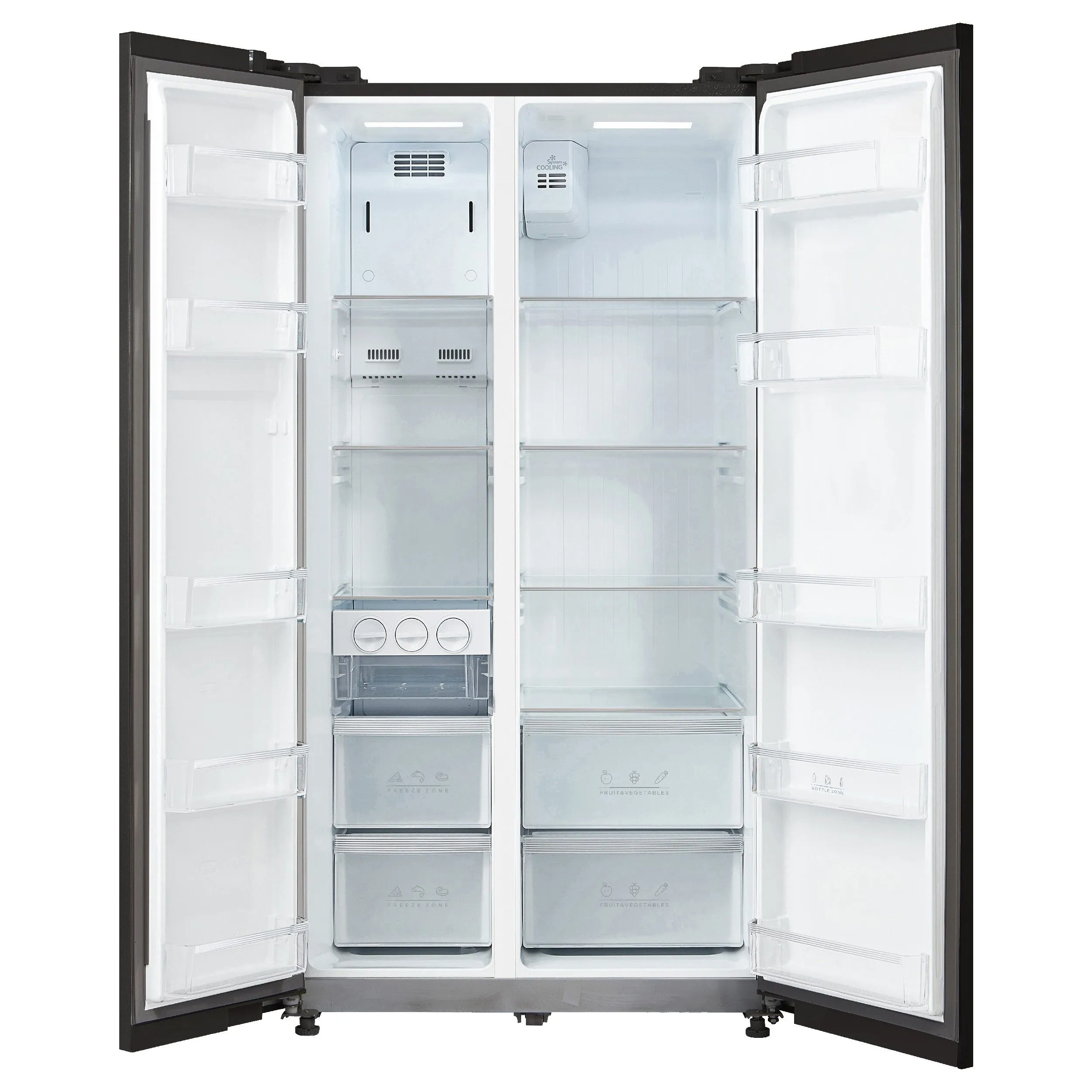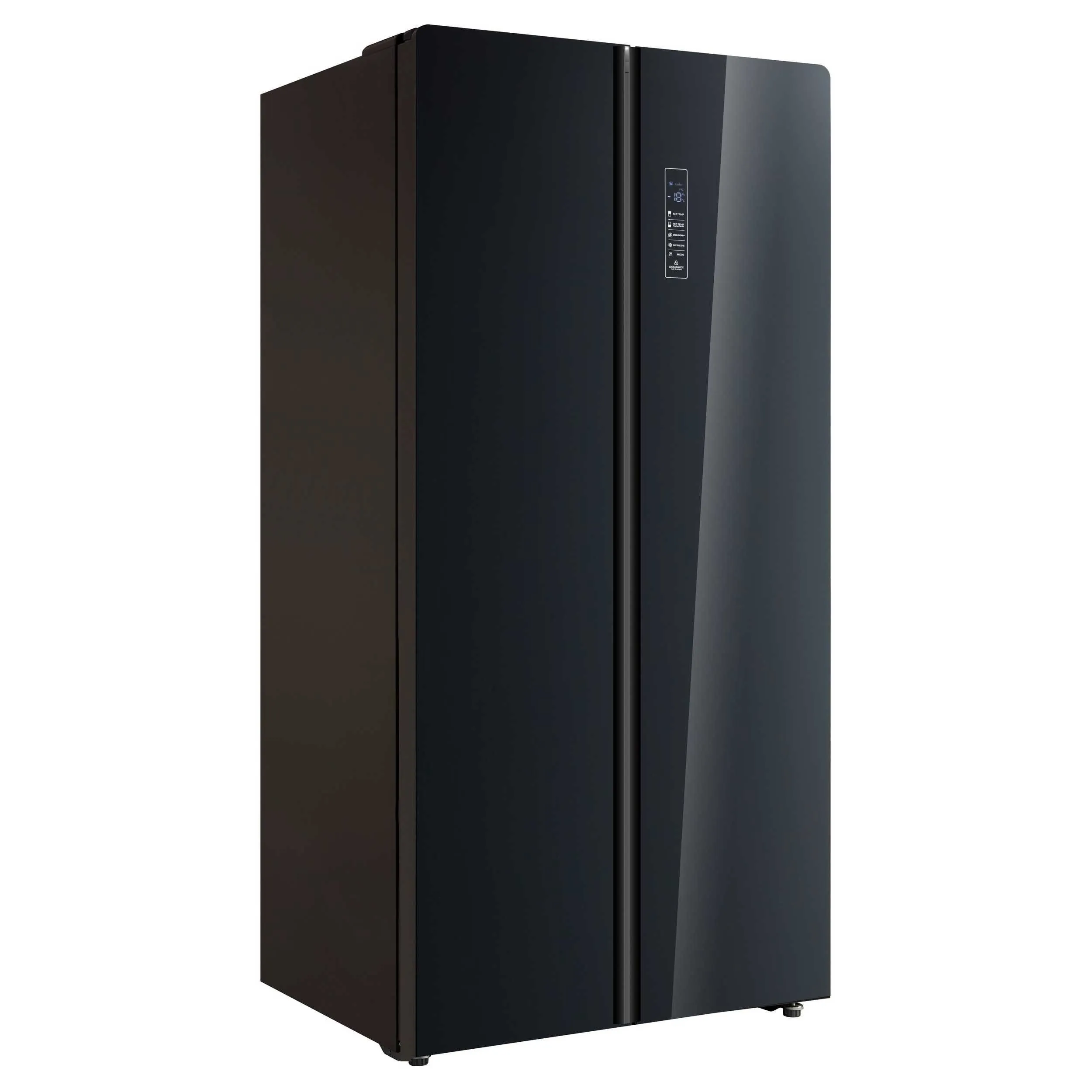 Холодильник Side-By-Side, А+, инверторный компрессор, cенсорное управление Smart Touch, Full NO FROST, Dynamic Air Cooling, скрытые ручки,  режимы «Супер заморозка» и «Супер охлаждение», LED освещение камеры,  2 ящика для овощей, полки из закаленного стекла, держатели для бутылок, контейнер для льда, объем холодильного отделения: 335 л, объем морозильного отделения: 175 л, габариты (ВхШхГ):  1788х895х745  мм,  цвет - черное стекло