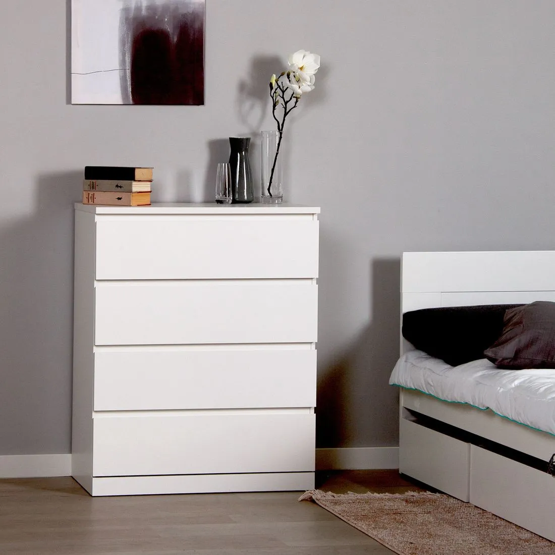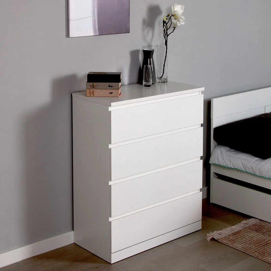 Комод Варма 4, 803х400х1002, цвет Белый. Стильный удобный комод с четырьмя выдвижными ящиками. Прекрасно дополнит интерьер и теплую уютную домашнюю атмосферу. Хорошие параметры функциональности (качественные телескопические направляющие, вместительность, удобство использования). Поверхность окрашена экологически безопасными материалами, продолжительное время сохраняет внешний вид. Отлично сочетается в интерьере со стеллажами и полками Фора, журнальными столиками и ТВ-тумбами Энкель, стеллажами Варма. Доступен к заказу не только в белом цвете, но и с покрытием натуральным шпоном (беленый дуб, черный). Преимущества: эстетичный внешний вид; вместительность; простая сборка; экологичность и высокое качество окраски (экологически безопасные материалы); высококачественные телескопические направляющие (мягкое открывание). Крепежные элементы (дюбель-гвозди) приобретаются Покупателем дополнительно в зависимости от материала стены. Гарантийный срок для жилых и общественных помещений 24 месяца.