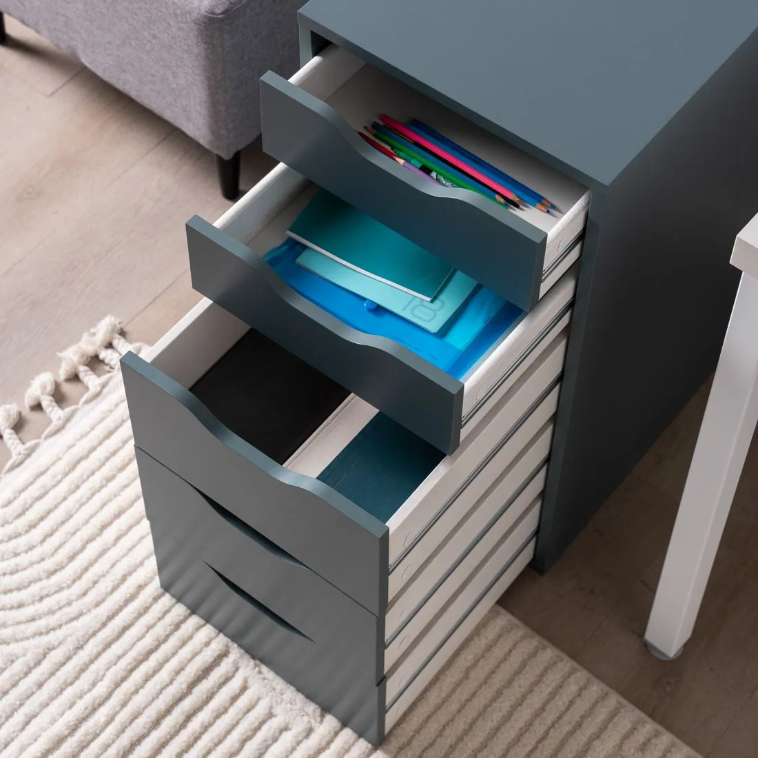 Комод Ингар 5, 36х71х53, цвет серо-бирюзовый. Узкий комод с пятью выдвижными ящиками. Конструкция: ДСП, поверхность, декорированная бумага, окраска УФ материалами. Фасады ящиков без ручек, с вырезами для удобного выдвижения. Ящики переменной высоты позволяют использовать их для хранения разнообразных предметов. Гарантийный срок для жилых и общественных помещений 24 месяца.