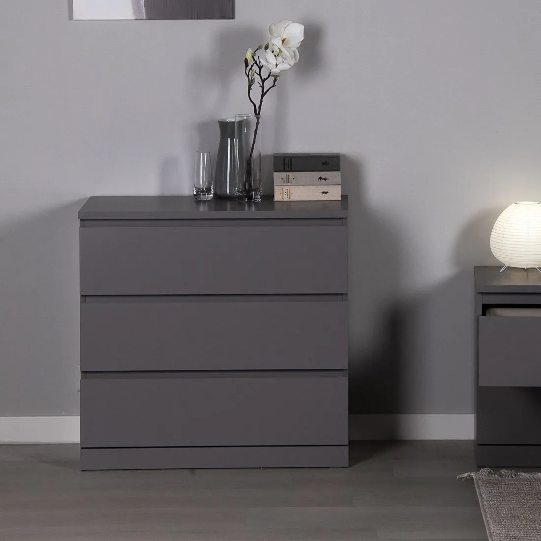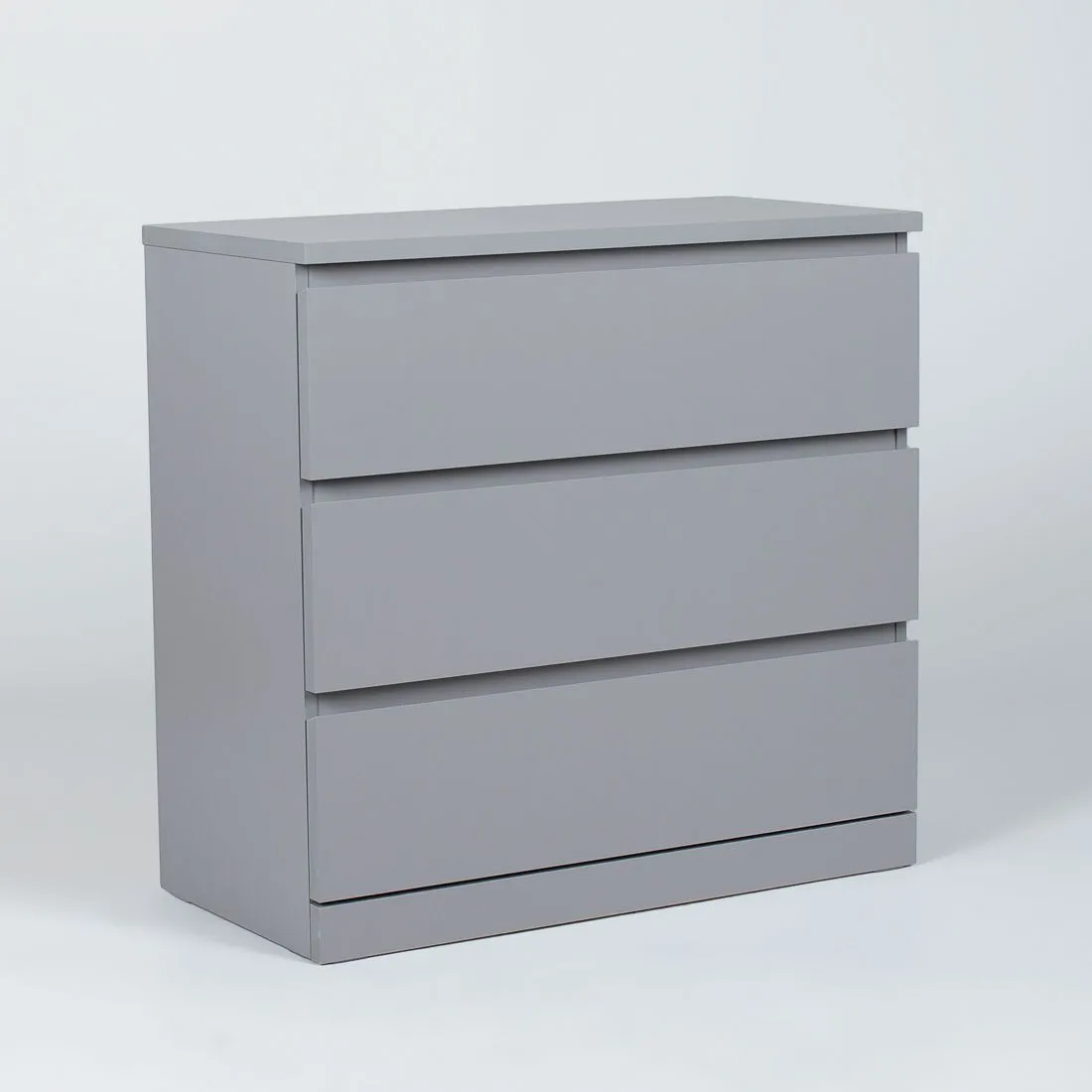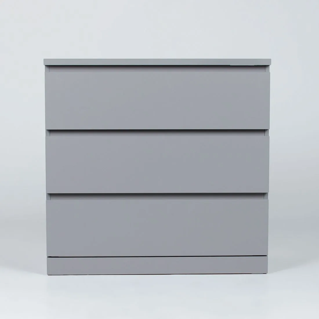 Комод Варма 3, 803х400х775, цвет Серый. Стильный удобный комод с тремя выдвижными ящиками.  Прекрасно дополнит интерьер и теплую уютную домашнюю атмосферу. Хорошие параметры функциональности (качественные телескопические направляющие, вместительность, удобство использования). Поверхность окрашена экологически безопасными материалами, продолжительное время сохраняет внешний вид. Отлично сочетается в интерьере со стеллажами и полками Фора, журнальными столиками и ТВ-тумбами Энкель, стеллажами Варма. Доступен к заказу не только в сером цвете, но и в белом, и с покрытием натуральным шпоном (беленый дуб, черный). Преимущества: эстетичный внешний вид; вместительность; простая сборка; экологичность и высокое качество окраски (экологически безопасные материалы); высококачественные телескопические направляющие (мягкое открывание). Крепежные элементы (дюбель-гвозди) приобретаются Покупателем дополнительно в зависимости от материала стены. Гарантийный срок для жилых и общественных помещений 24 месяца.