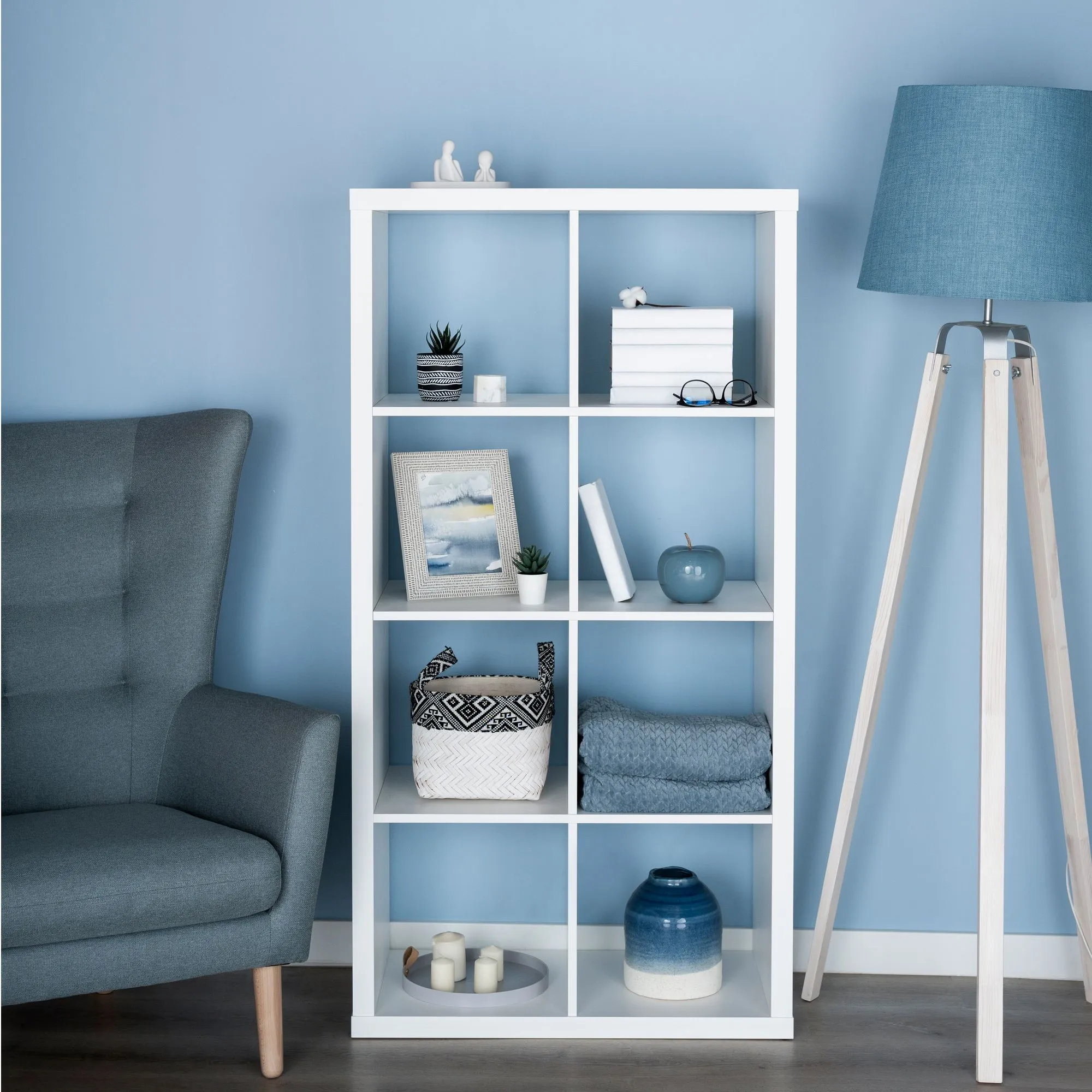 Стеллаж Фора 8, прямоуголной формы с двумя рядами открытых ячеек в количестве восьми штук, 764х380х1467, цвет Белый.  В зависимости от условий использования, легко может стать стильной навесной удобной полкой с тремя ячейками. В сочетании с аксессуарами (полка Фора 4.1, комплект выдвижных ящиков Фора 4.2, дверца Фора 4.3) приобретает дополнительную функциональность и меняет визуальное восприятие. Конструкция рамы - тамбурат (рамка из ДСП и HDF с сотовым заполнением) - популярная современная технология, активно внедряемая крупнейшими производителями для изготовления мебели по скандинавским стандартам. Отлично сочетается в интерьере со стеллажами и полками Фора, журнальными столиками и ТВ-тумбами Энкель, комодами и стеллажами Варма.Преимущества стеллажа, такие, как: облегченная конструкция (тамбурат); высокая прочность; простая сборка; эстетичный внешний вид; возможность установки дополнительных аксессуаров; вртикальная либо горизонтальная установка, - открывают возможность широкого применения стеллажа в интерьере в стиле сканди, минимализм, лофт. Крепежные элементы (дюбель-гвозди) приобретаются Покупателем дополнительно в зависимости от материала стены. Гарантийный срок для жилых и общественных помещений 24 месяца.