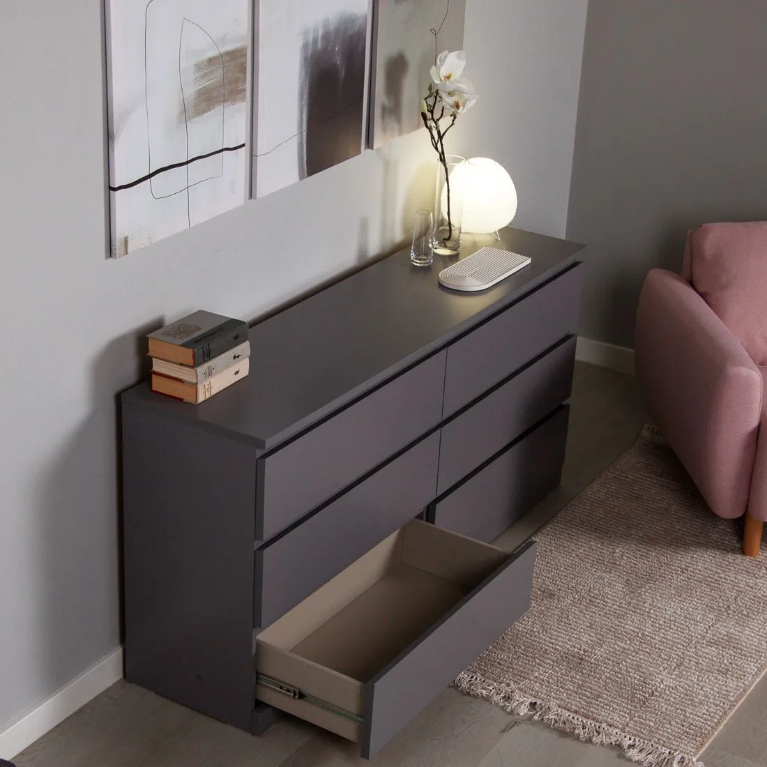 Отлично сочетается в интерьере со стеллажами и полками Фора, журнальными столиками и ТВ-тумбами Энкель, стеллажами Варма. Доступен к заказу не только в сером цвете, но и в белом, и с покрытием натуральным шпоном (беленый дуб, черный). Преимущества: эстетичный внешний вид; вместительность (ширина 1600 мм, высота 780 мм); простая сборка; экологичность и высокое качество окраски (экологически безопасные материалы); высококачественные телескопические направляющие (мягкое открывание).