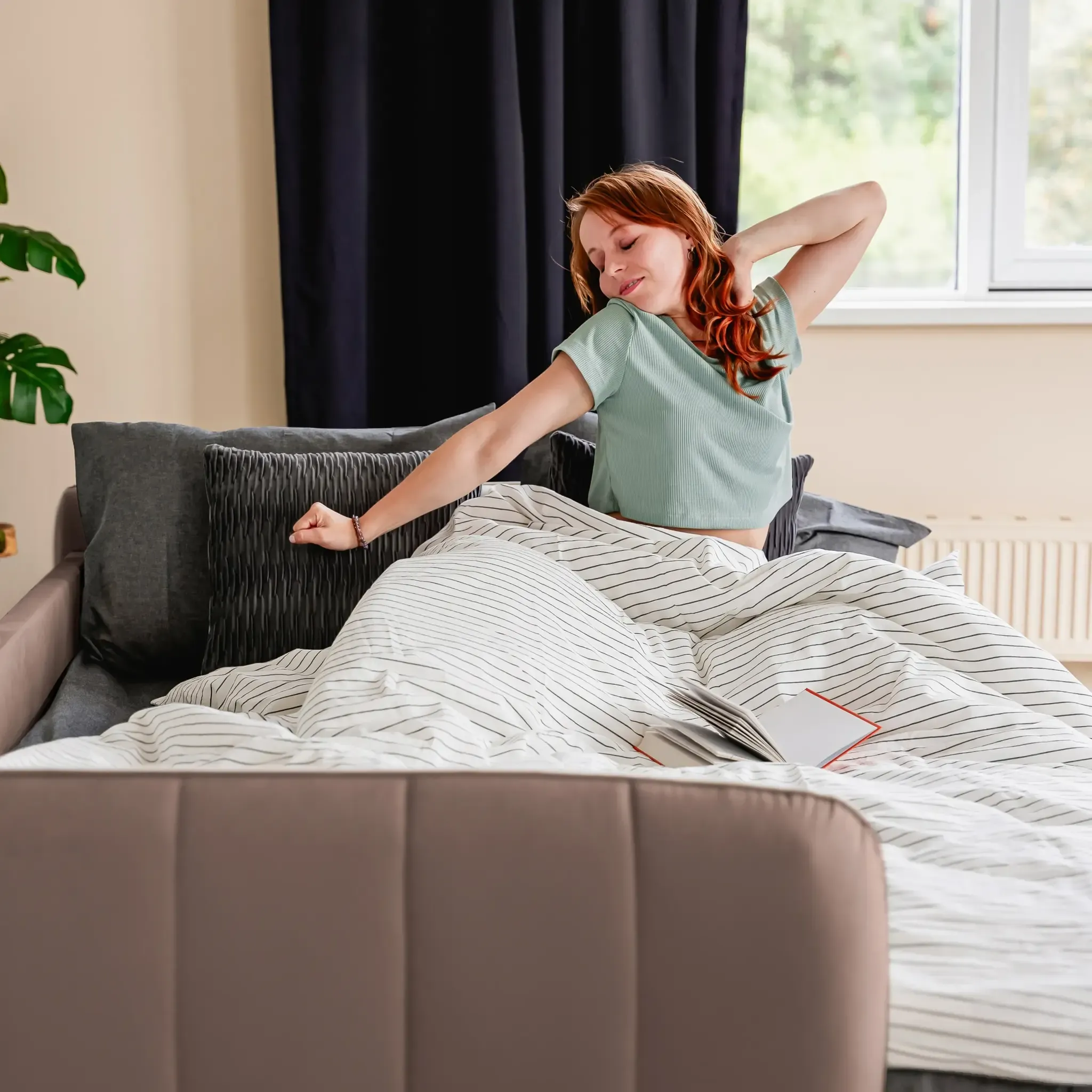 Благодаря проработанному наполнению, диван обеспечивает комфорт при повседневном использовании. «Счастливый день» оснащен механизмом «пантограф» и трансформируется в спальное место для ежедневного сна. Фальш-спинка позволяет раскладывать диван, не отодвигая его от стены.