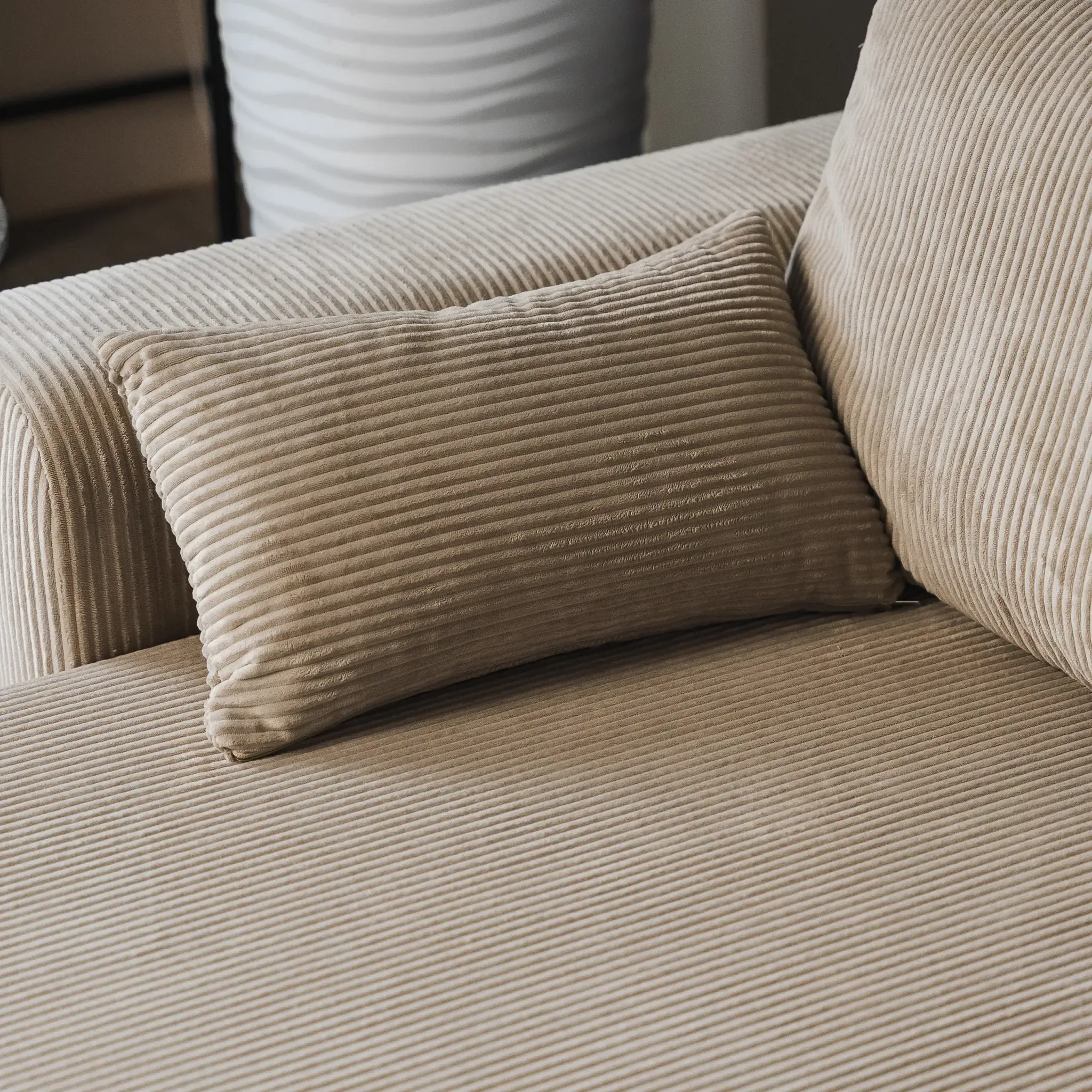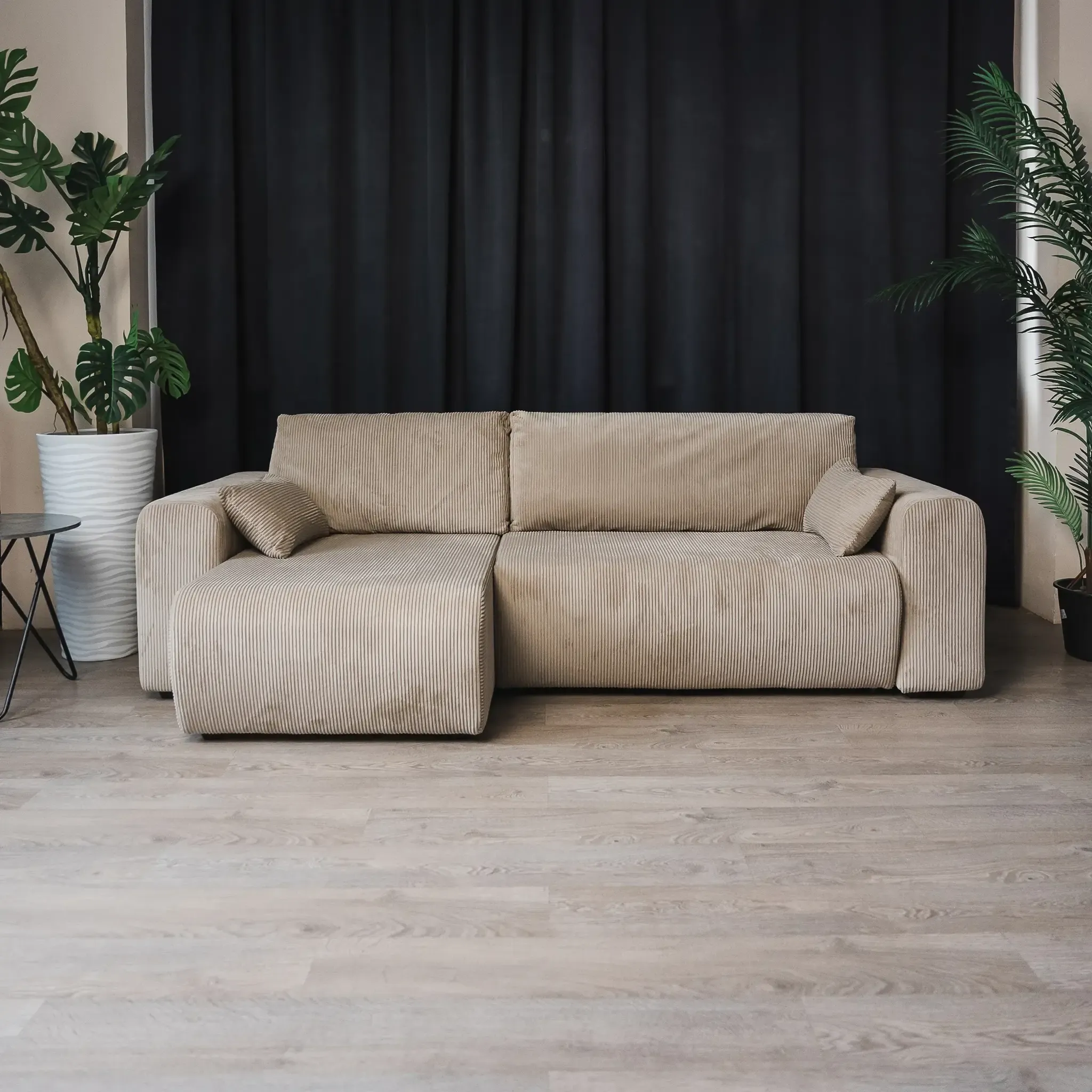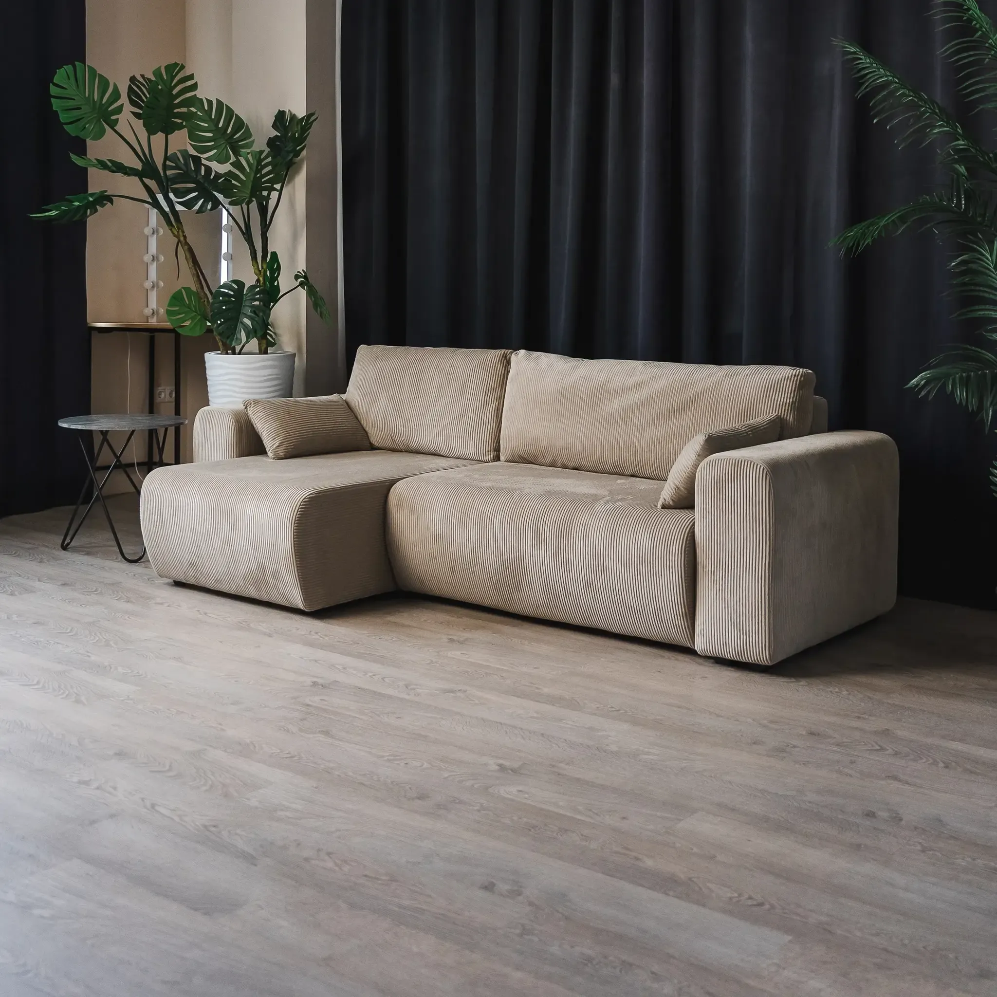 Универсальный угол дивана позволяет адаптировать его под любую планировку комнаты, а мягкий велюр CILIUM с рельефной фактурой добавляет интерьеру уюта и изысканности. Базовая обивка спинки делает диван универсальным элементом зонирования, создавая уютные уголки для отдыха или общения. В комплекте с диваном вы получаете набор стильных декоративных подушек.