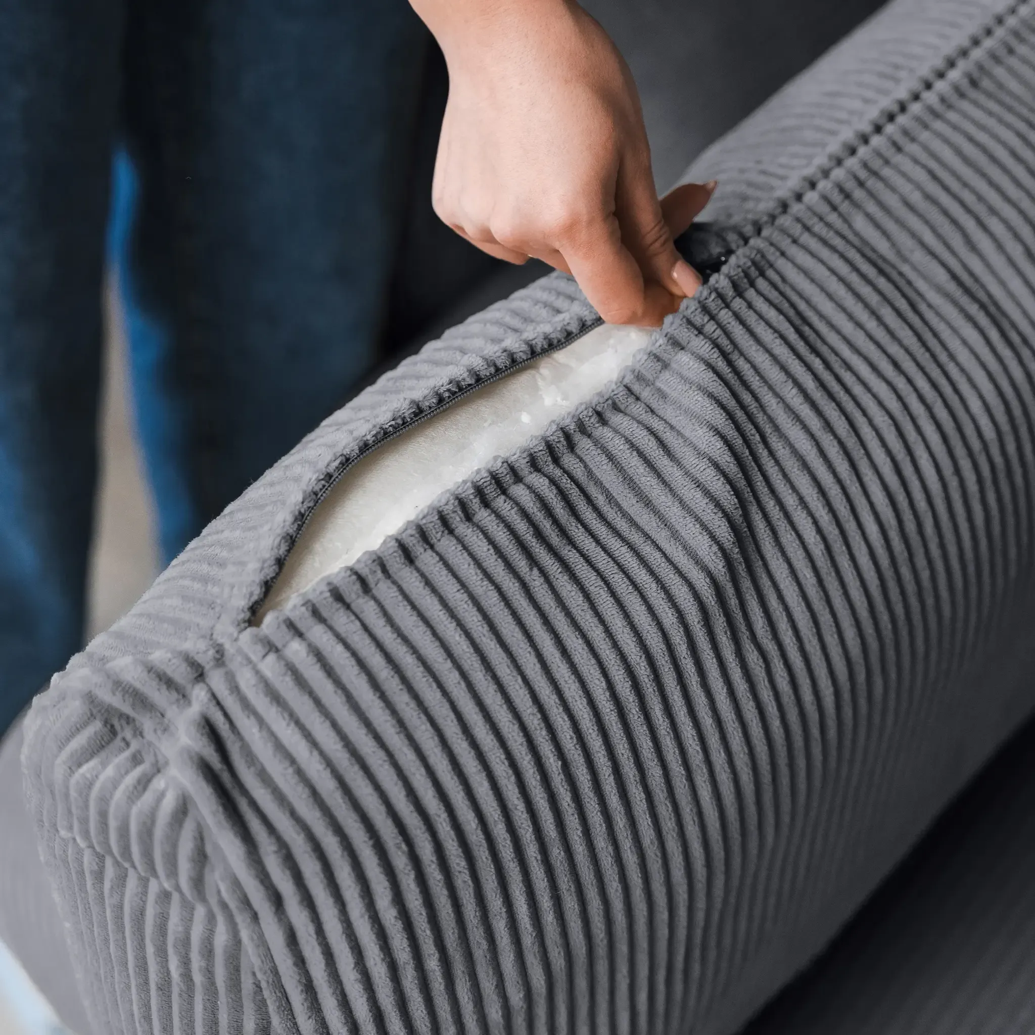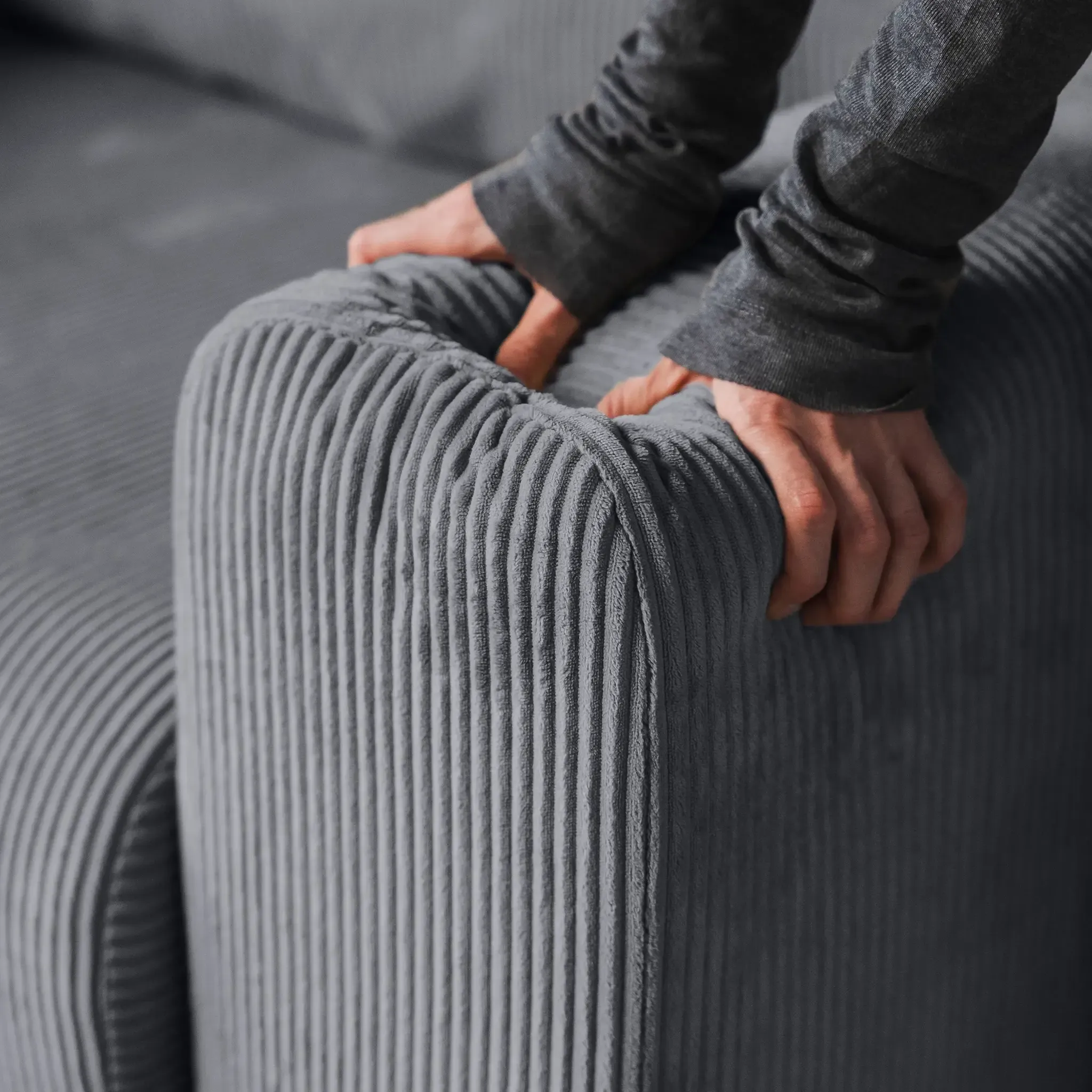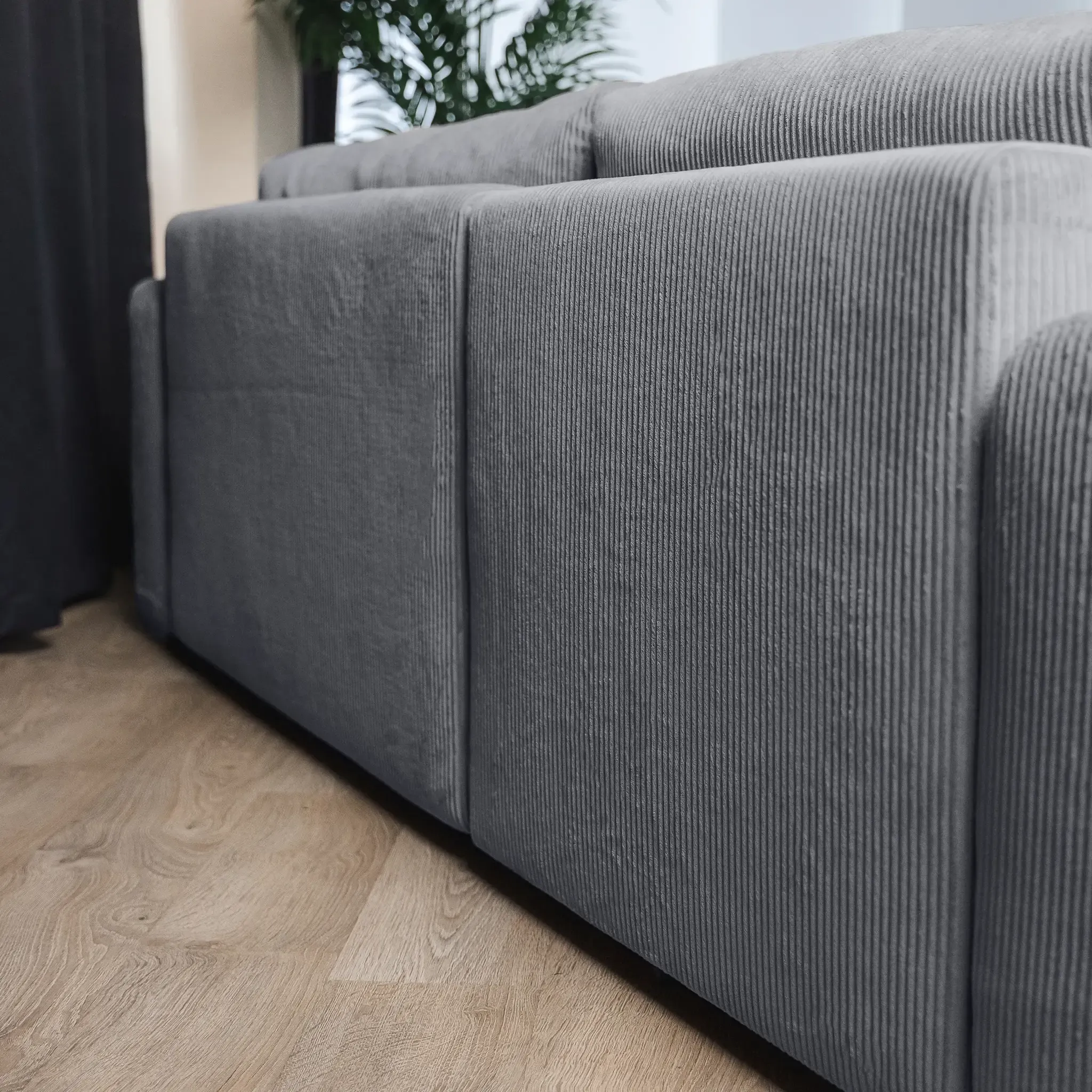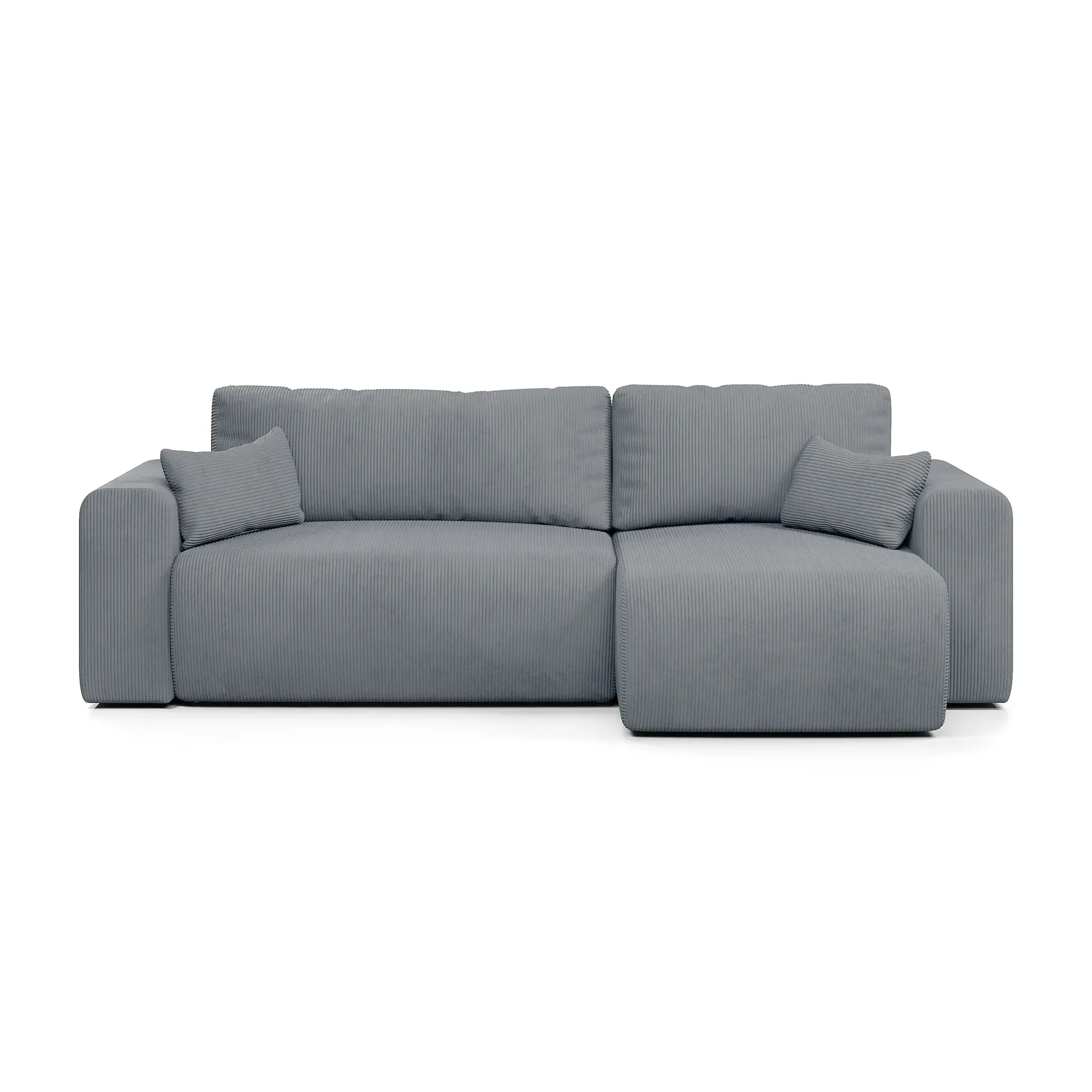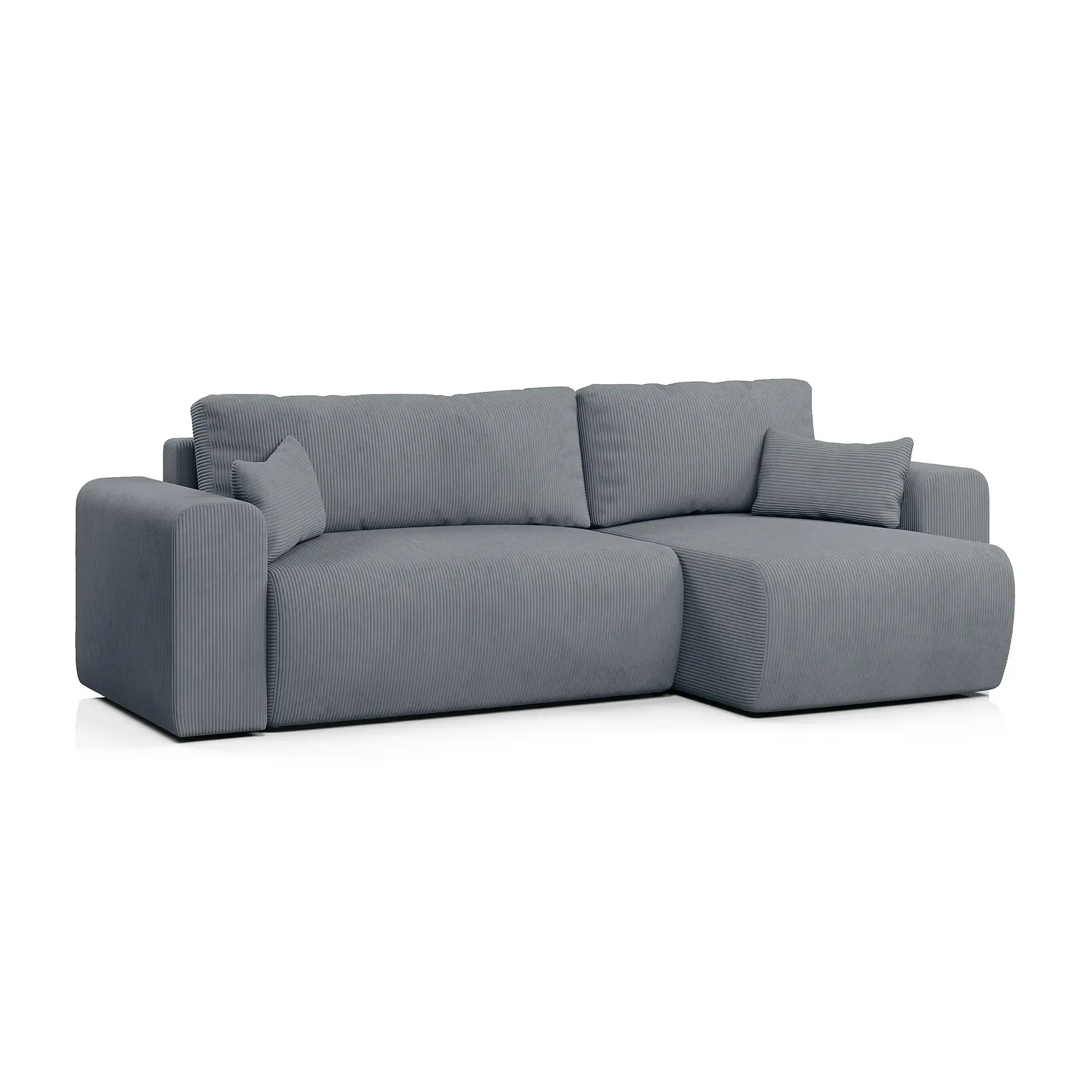 Универсальный угол дивана позволяет адаптировать его под любую планировку комнаты, а мягкий велюр CILIUM с рельефной фактурой добавляет интерьеру уюта и изысканности. Базовая обивка спинки делает диван универсальным элементом зонирования, создавая уютные уголки для отдыха или общения. В комплекте с диваном вы получаете набор стильных декоративных подушек.