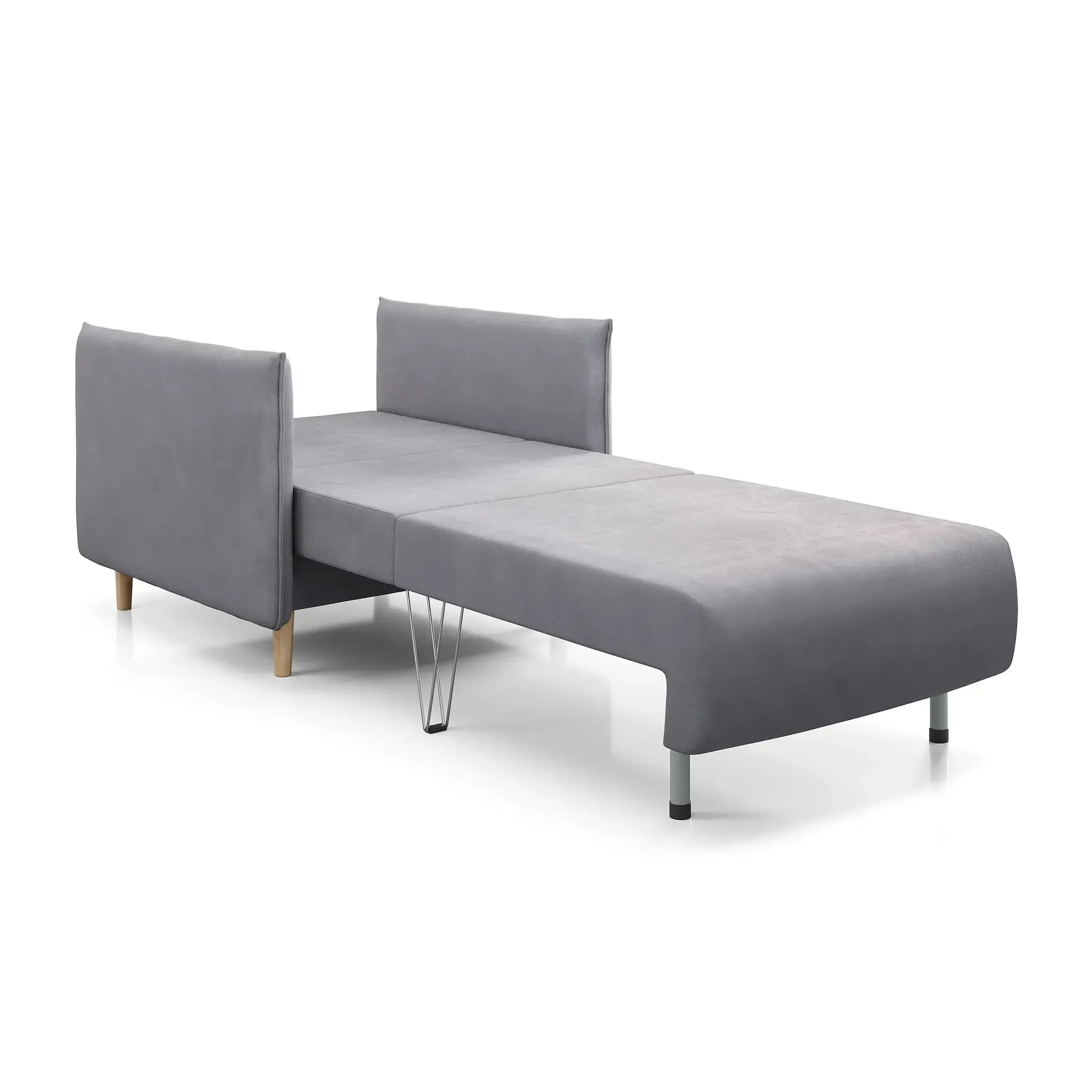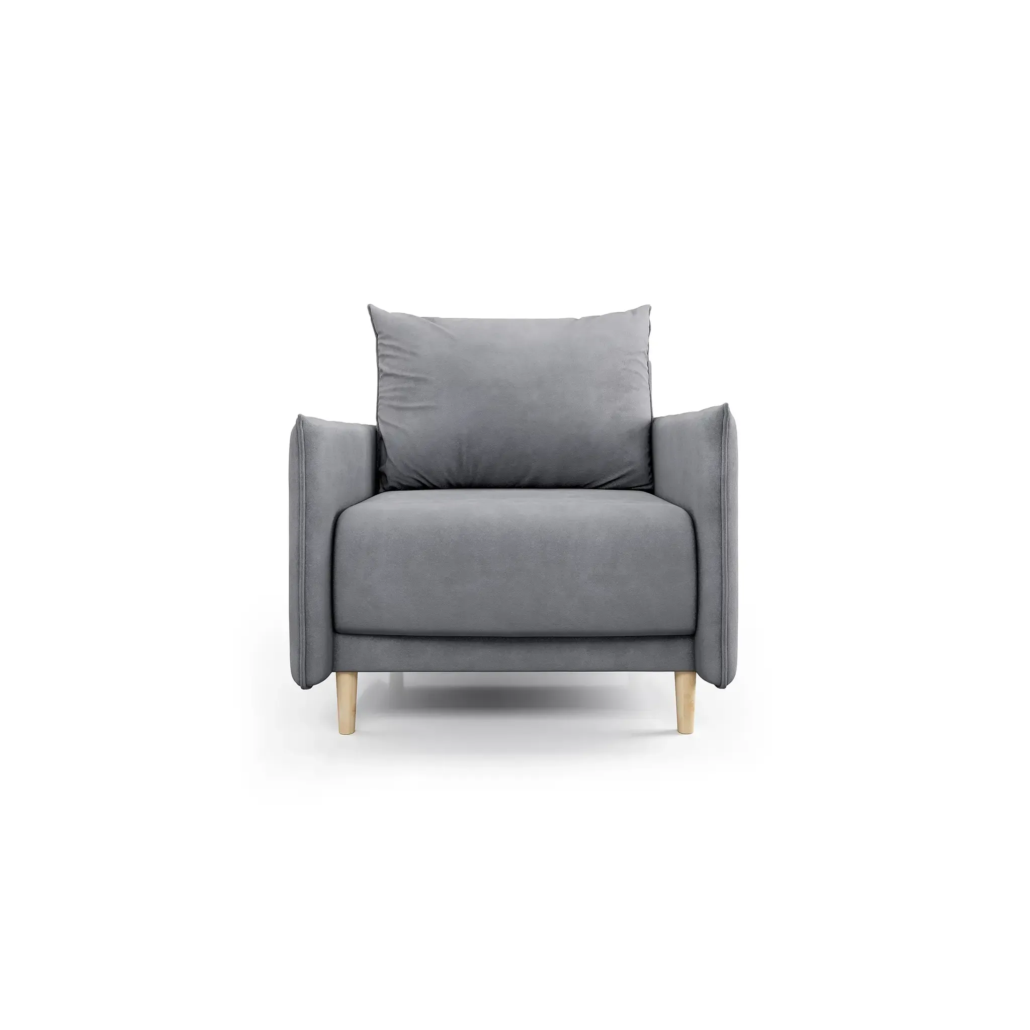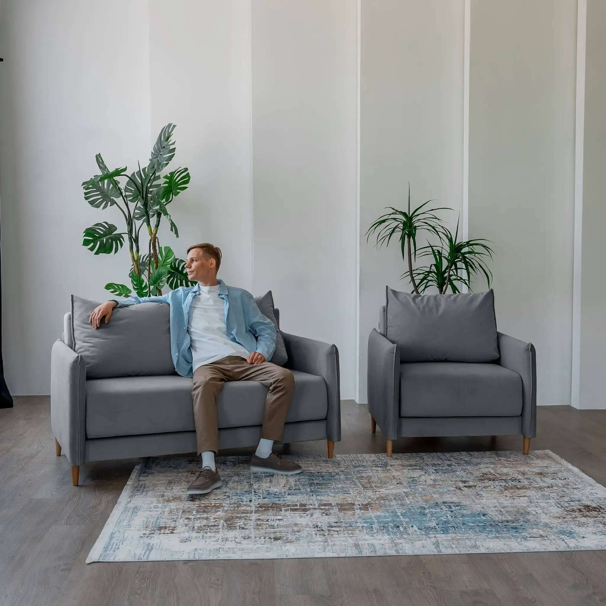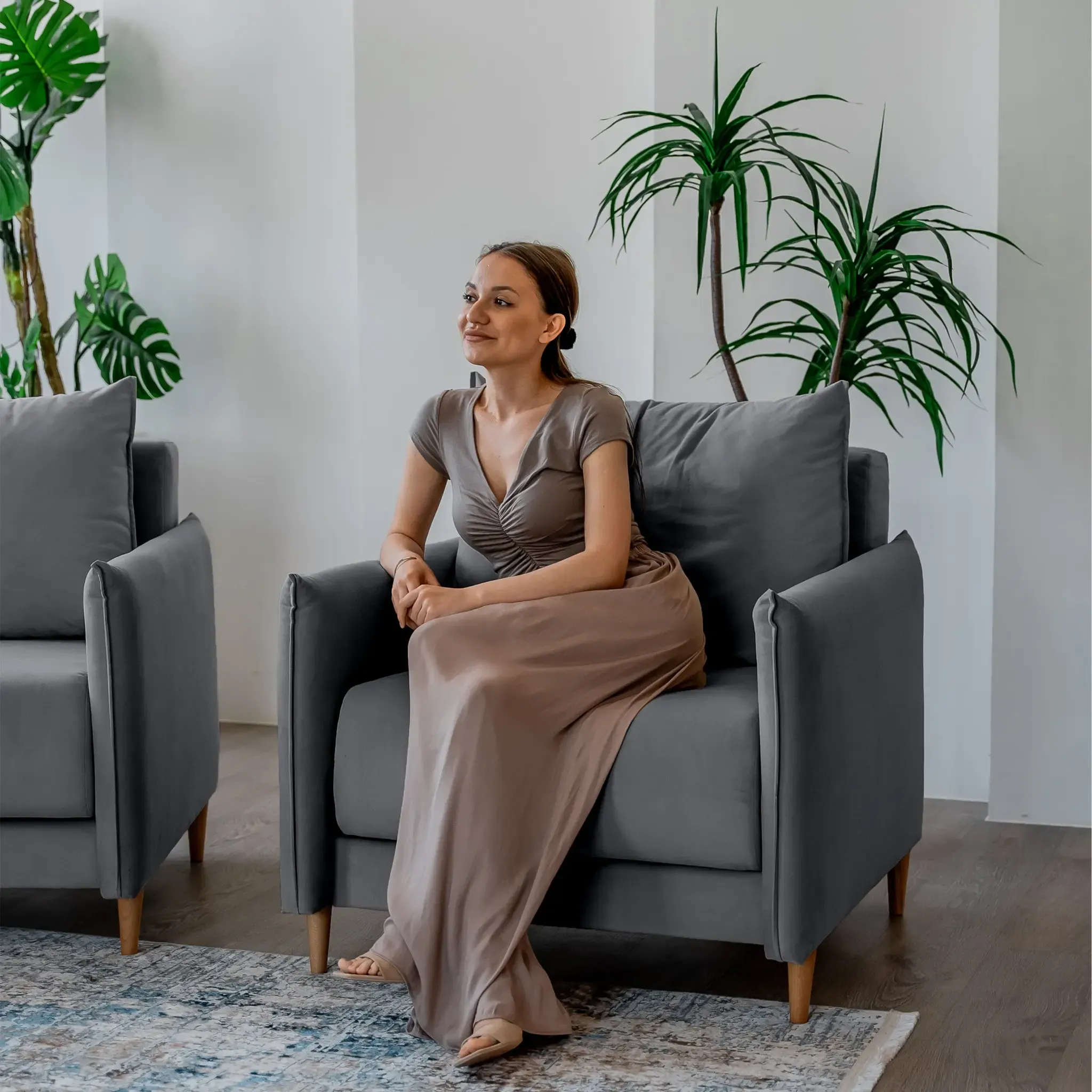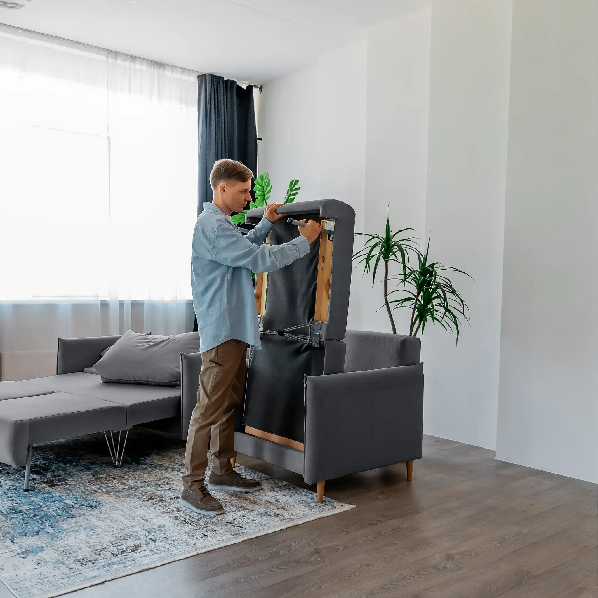 Представляем вашему вниманию серые кресла из нашей популярной коллекции «Лучший друг». Это удобное место как для отдыха после рабочего дня, так и для приёма гостей – ночью оно легко превращается в комфортную кровать благодаря механизму аккордеон-евро. Прочный каркас из фанеры и ДСП обеспечивает долгий срок службы мебели, а пружинный блок делает её идеальной опорой для вашего тела во время сна. Чехол выполнен из велюровой ткани Velutto 12 благородного серого цвета, который прекрасно сочетается с любым интерьером.