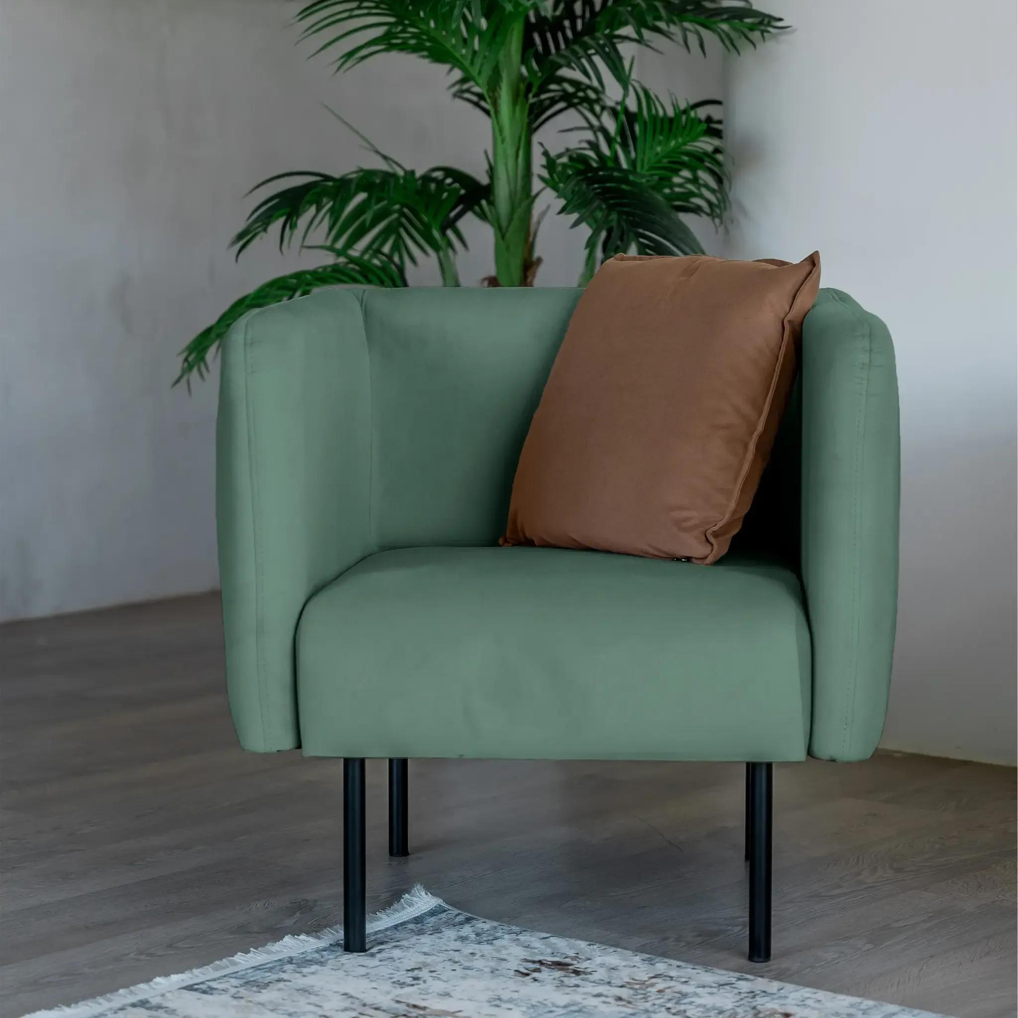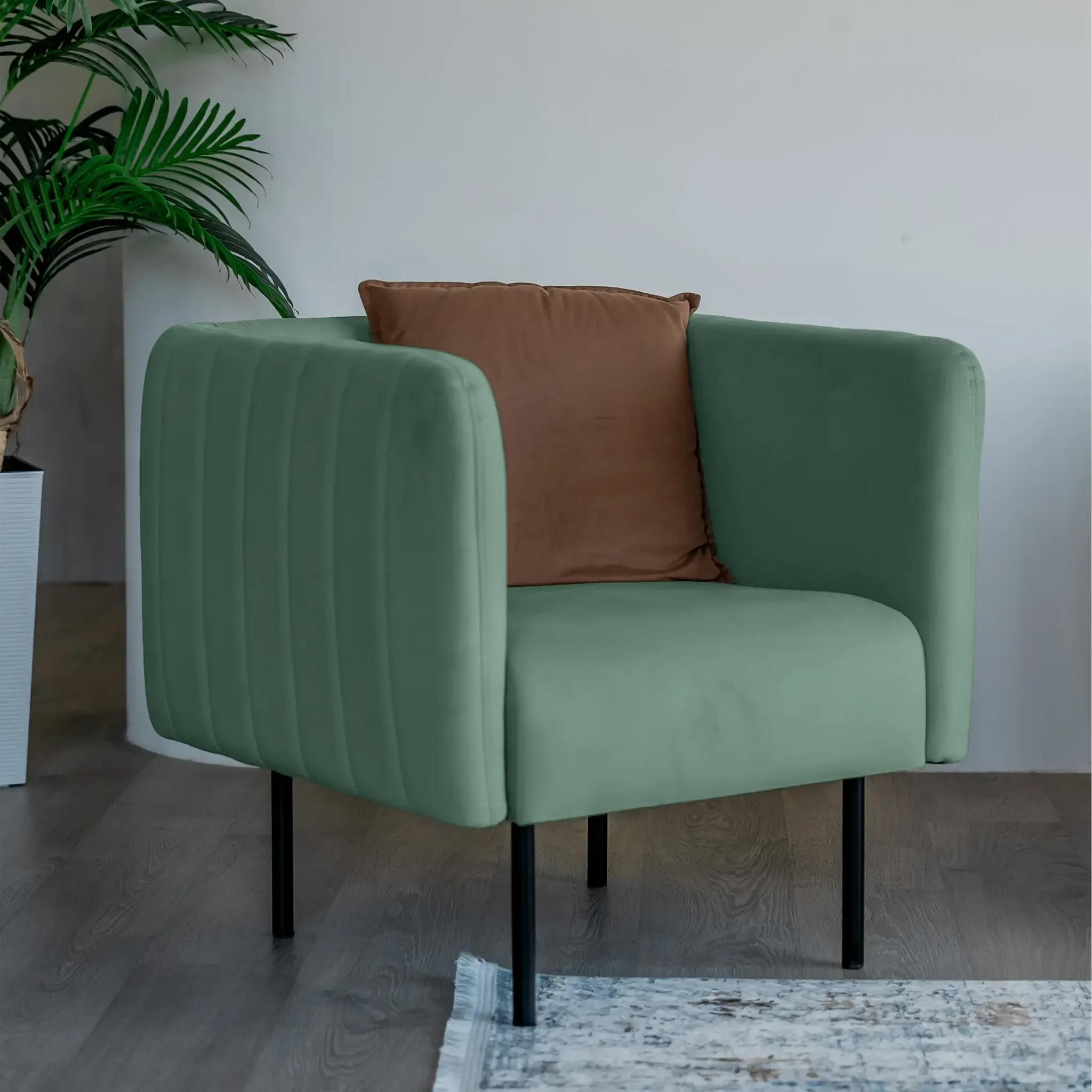 Ультрасовременное кресло РИО станет украшением дома, дачи, ресторана или офиса. Актуальный дизайн сочетается с удобством модели. Комфортное сиденье располагается на минималистичных ножках. Кресло смотрится легко и воздушно! Доступны яркие и нейтральные цвета обивки. ОБИВКА Обивка кресла - мягкий бархатистый велюр. Это тактильно приятная и очень практичная ткань.· Обивка имеет повышенный уровень износоустойчивости 60 000 циклов (по тесту Мартиндейла).· Ткань рекомендована для владельцев домашних животных.· Для велюра пригодна профессиональная химчистка, сухая чистка и чистка влажной губкой. ОСНОВАНИЕ Высокоплотный ППУ-матрас располагается на основании из пружинных змеек. Это гарантирует удобство и комфорт при отдыхе на кресле. КАРКАС В конструкции кресла используются сертифицированные материалы из натурального дерева и экологичная фанера. Каркас надежный, прочный, долговечный и безопасный! Характеристики:  Габариты (см): 70х70х75 Высота посадочного места (см): 45 Каркас: Фанера / ДСП Высота ножек (см): 22 Вес (кг): 17  Фабрика D1 является российским производителем мебели. Мы осуществляем полный производственный цикл всего представленного ассортимента. Все используемые материалы и комплектующие сертифицированы и соответствуют САНПиН. На всю нашу продукцию мы даём гарантию 18 месяцев.