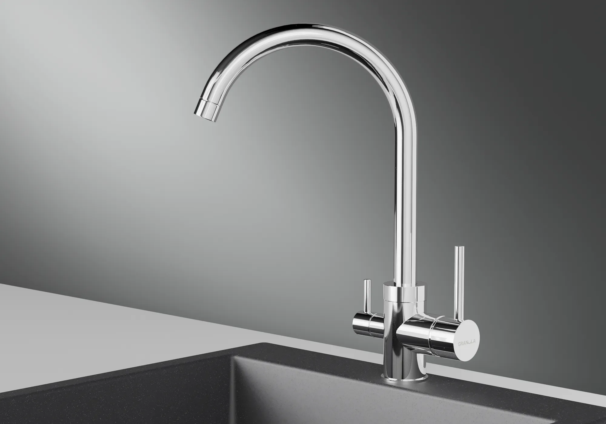Смеситель для кухонной мойки Granula 2168 изготовлен из высококачественного материала. Латунный корпус обеспечивает длительный срок службы. При этом высокий излив позволяет мыть как мелкую, так и крупногабаритную посуду. Двухрычажная модель смесителя Granula 2168 выполнена с краном для питьевой воды. Фильтрованная вода подается по отдельной трубке и не смешивается с водопроводной водой. Покупателям предлагаются различные типы смесителей, окрашенные в тон моек Granula и StandART.Все модели смесителей для кухонных моек во всех цветах Вы можете посмотреть и приобрести на нашем сайте или в наших представительствах в регионах.Если у Вас остались вопросы, обращайтесь к нашим консультантам.